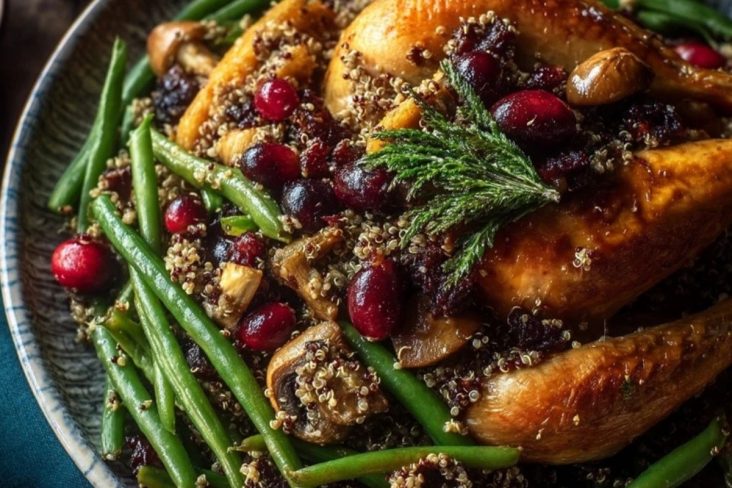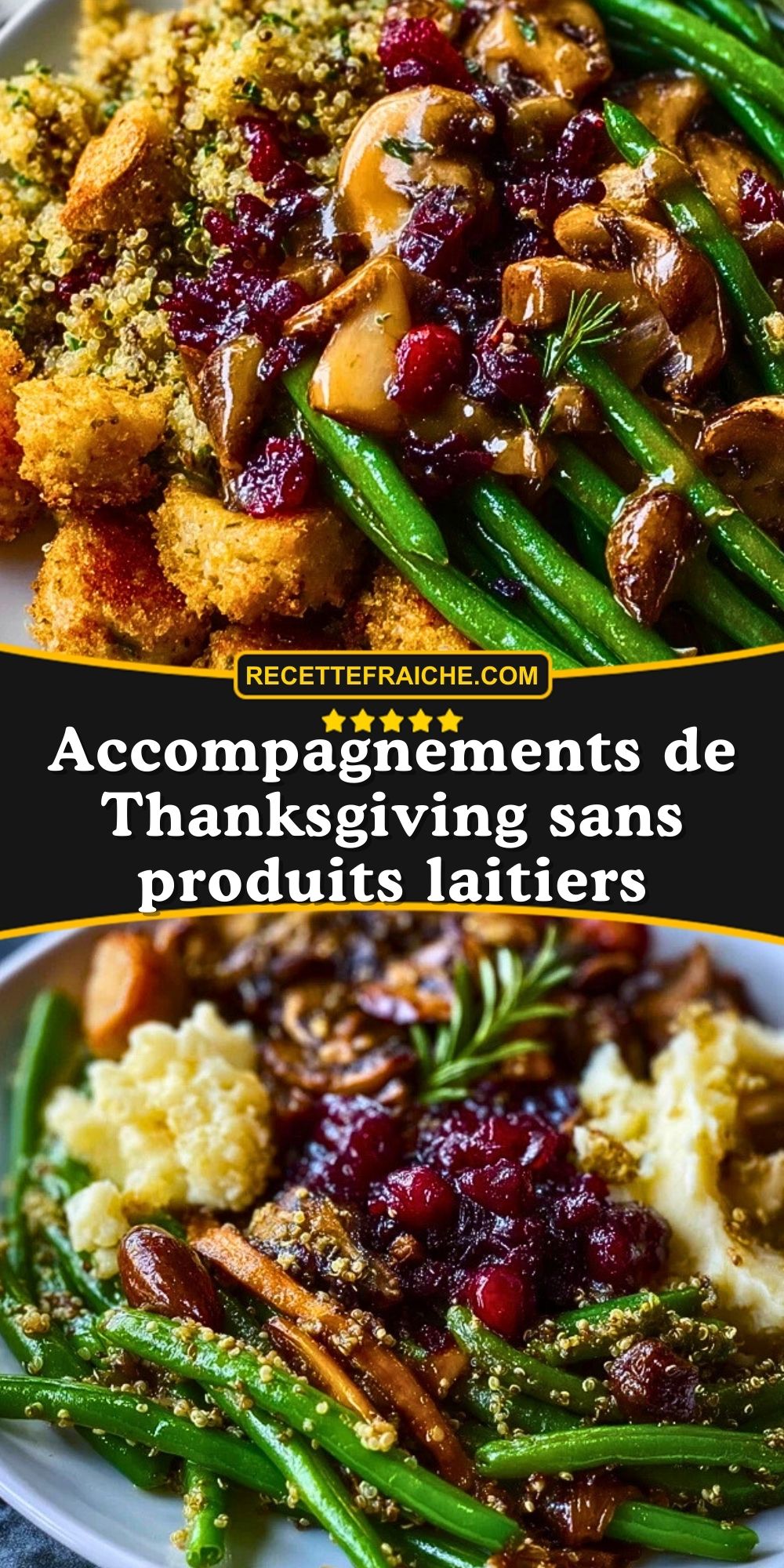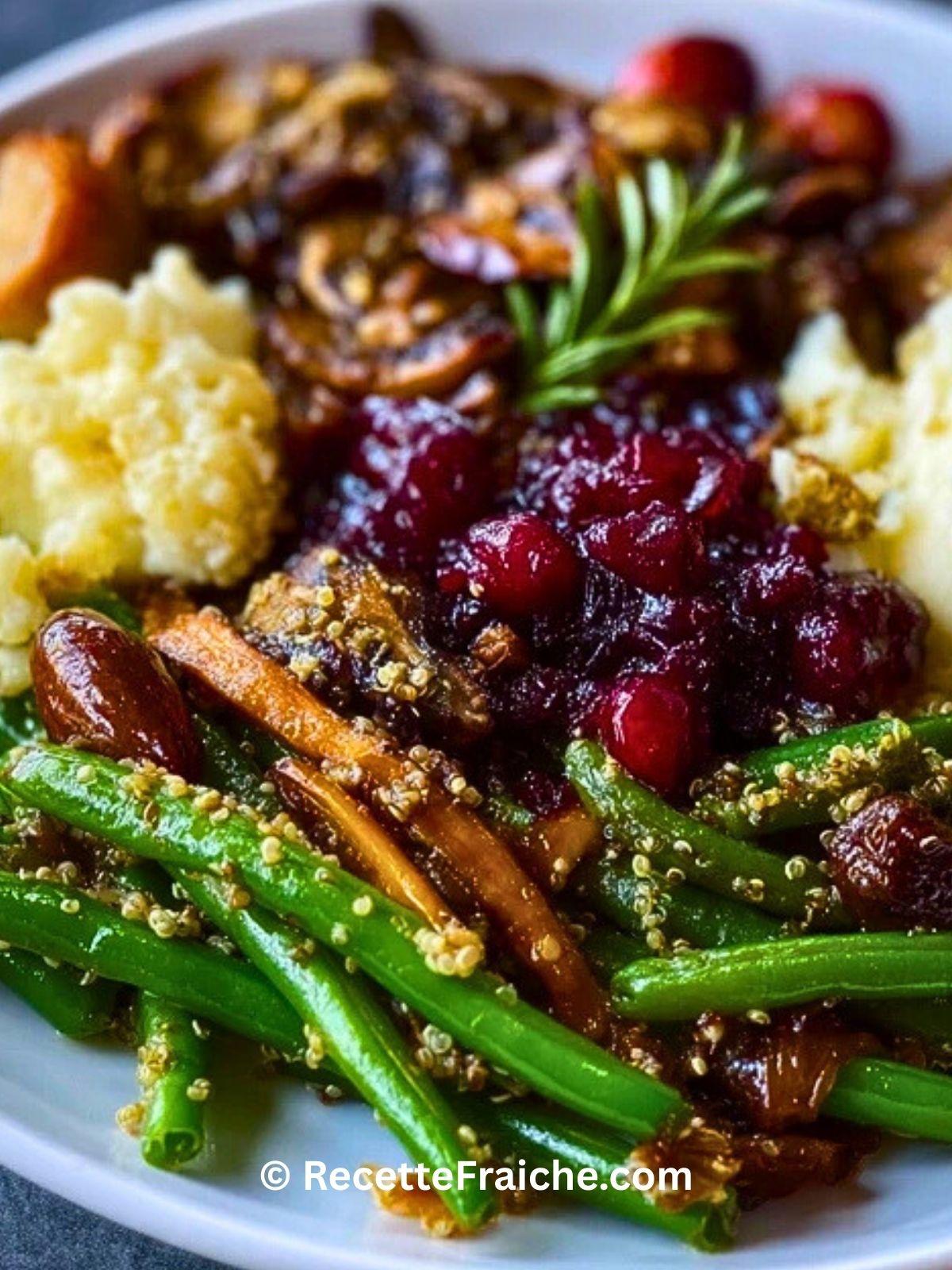 Accompagnements de Thanksgiving sans produits laitiers : une recette festive, saine et colorée à base de haricots verts, quinoa, champignons, canneberges et herbes fraîches. Parfait pour régaler tous vos invités, vegan ou non.