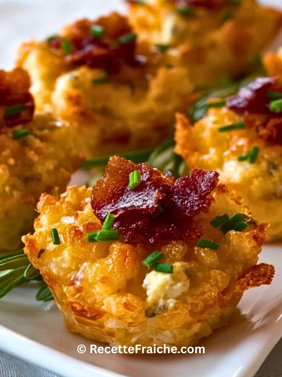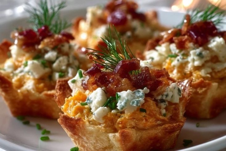 Faites cuire 12 à 15 minutes jusqu’à ce que la garniture soit bien prise et légèrement dorée. Laissez tiédir, puis ajoutez le bacon croustillant émietté, la ciboulette et un brin d’aneth sur chaque bouchée.