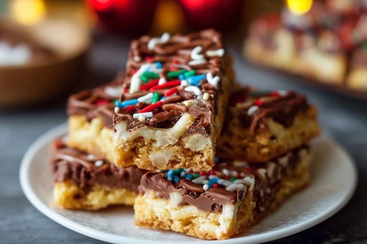Barres de biscuits aux spaghetti elfes : une gourmandise colorée, facile à réaliser, parfaite pour les fêtes. Base sablée, chocolat fondant, noix croquantes et vermicelles colorés pour un dessert festif qui plaira à toute la famille.