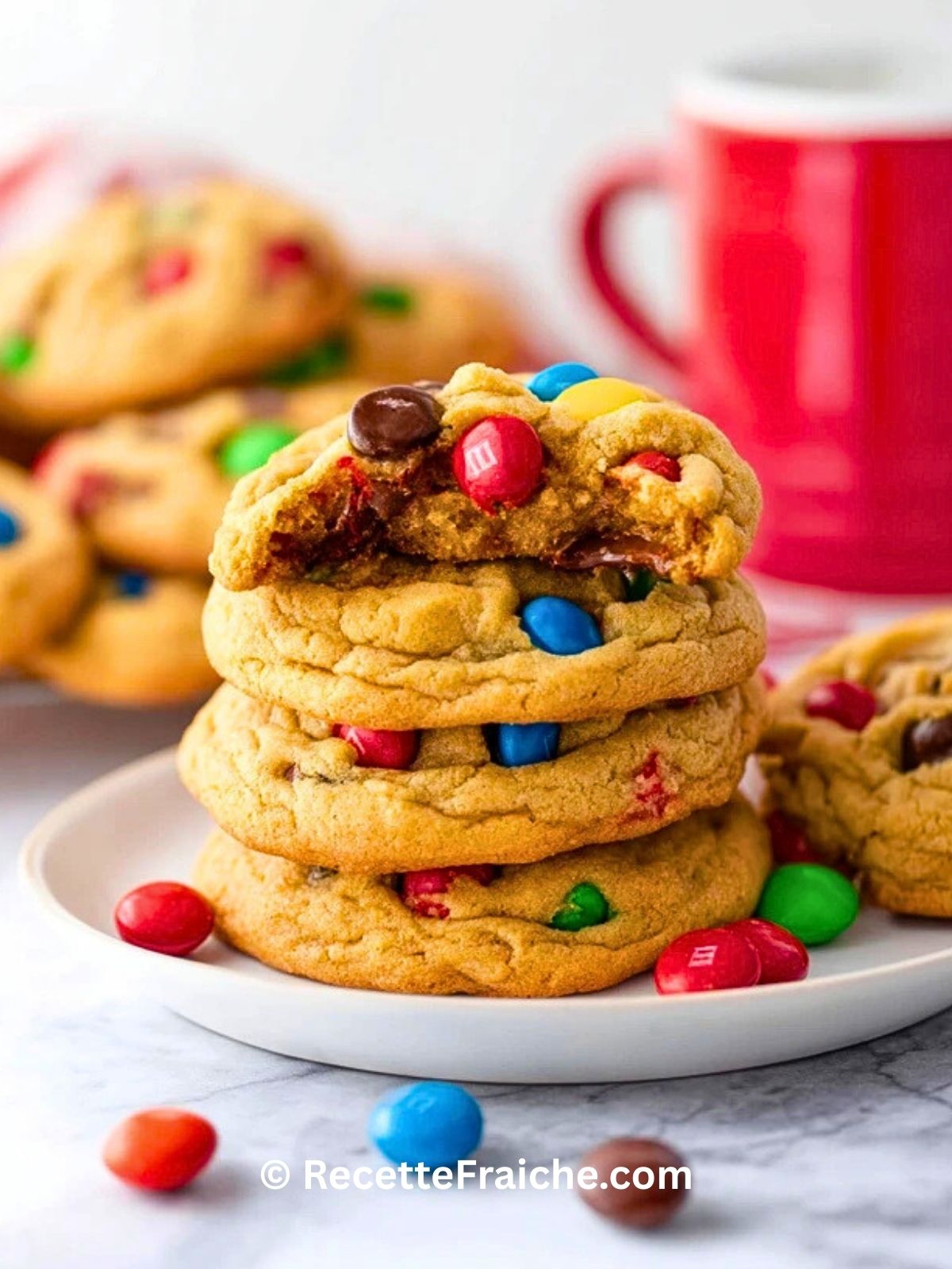 Pour des biscuits encore plus moelleux, ne les faites pas trop cuire : ils continueront à cuire légèrement en refroidissant. Si la pâte est trop collante, placez-la 15 minutes au réfrigérateur avant de façonner les boules. N’hésitez pas à varier les M&Ms (chocolat, cacahuète, crispy…) pour personnaliser selon les goûts !