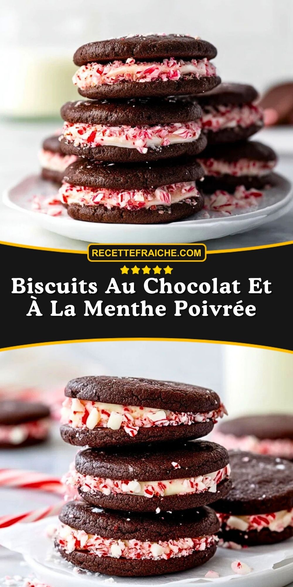 Fais fondre le chocolat avec la crème pour obtenir une ganache. Fouette le fromage frais avec le sucre glace. Étale une couche de ganache puis de crème sur un biscuit, referme avec un autre biscuit. Roule les bords dans les éclats de bonbons à la menthe.
