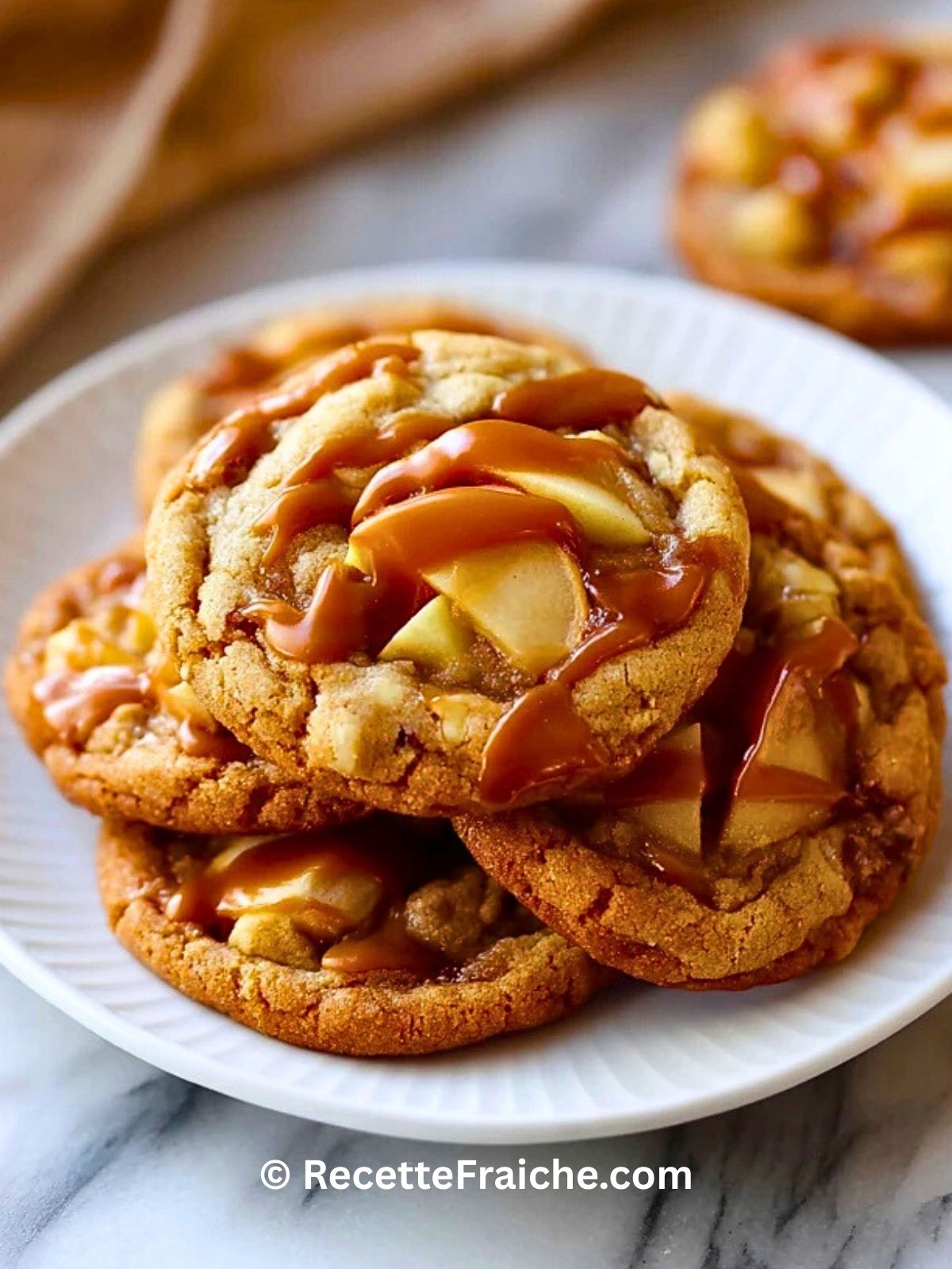 Ces biscuits aux pommes caramélisées sont moelleux au centre, légèrement croustillants sur les bords et garnis de dés de pomme fondants et de filets de caramel. Parfaits pour l’automne, le goûter ou un dessert rapide, ils réunissent toutes les saveurs de la tarte aux pommes dans un cookie facile, parfumé à la cannelle et totalement irrésistible.