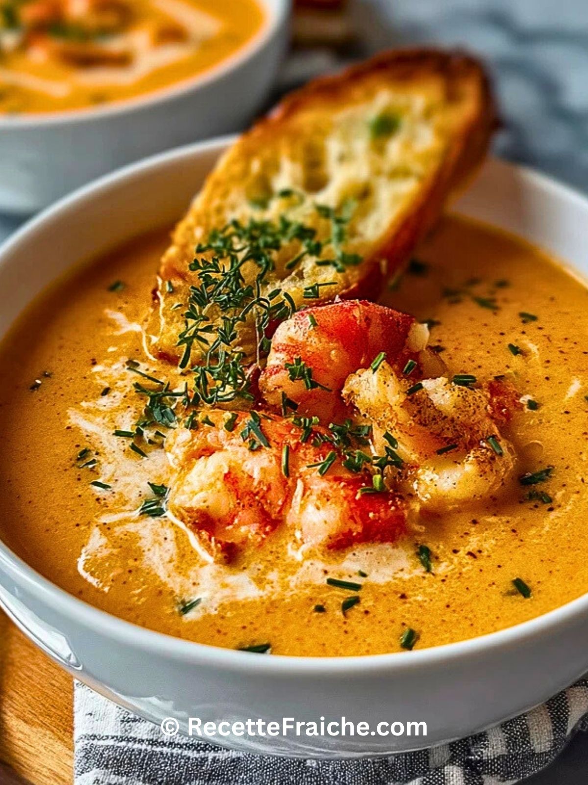 Ne laisse jamais bouillir après l’ajout de la crème et des fruits de mer : chauffe doucement pour garder une bisque bien veloutée et des crevettes tendres.