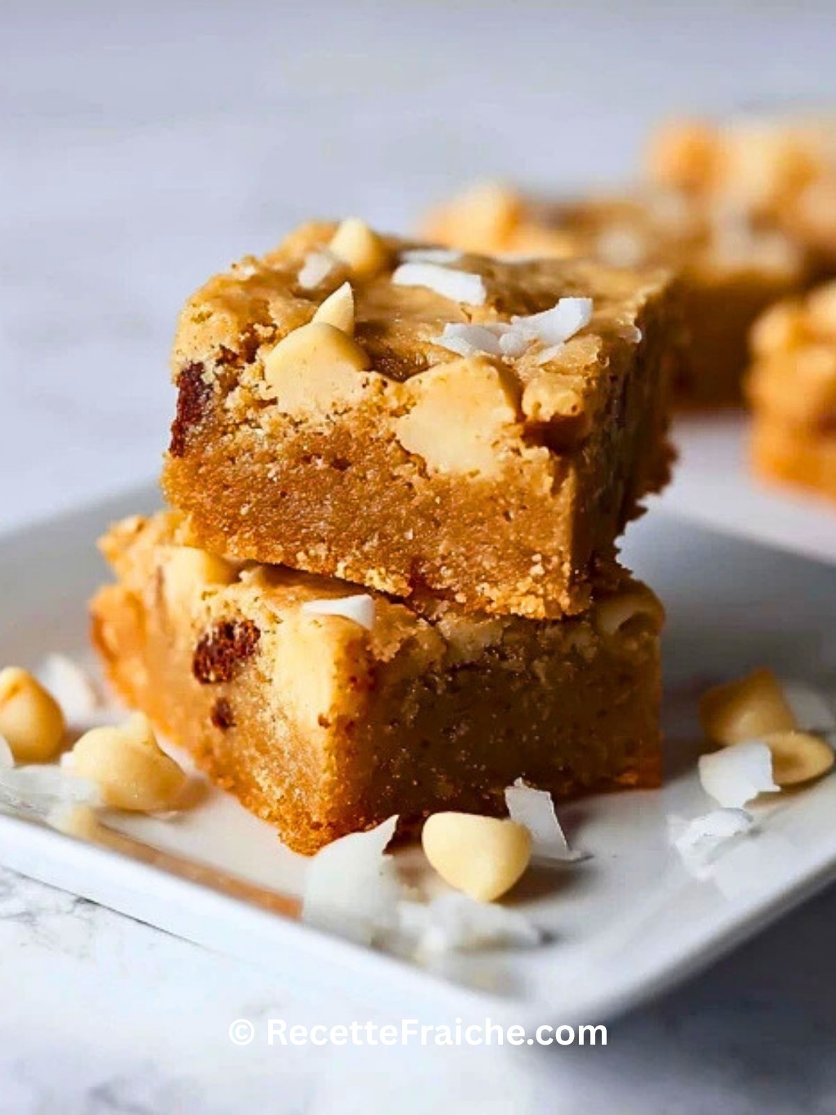 Keywords: blondie, chocolat blanc, noix de coco, goûter, moelleux, facile