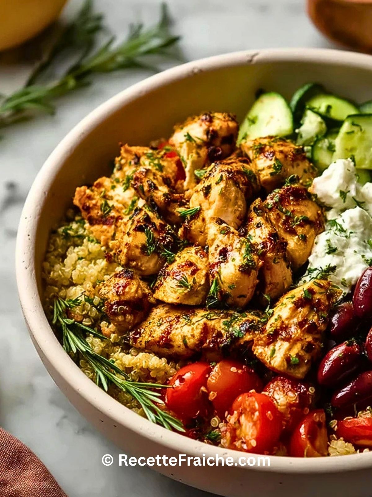 Ce bol de quinoa au poulet méditerranéen est une recette saine, complète et facile à préparer, parfaite pour un déjeuner équilibré ou un dîner léger. Avec son poulet mariné au citron, son quinoa moelleux, ses légumes croquants, sa feta et ses olives, il offre un repas riche en protéines, frais, gourmand et idéal pour le meal prep de la semaine.