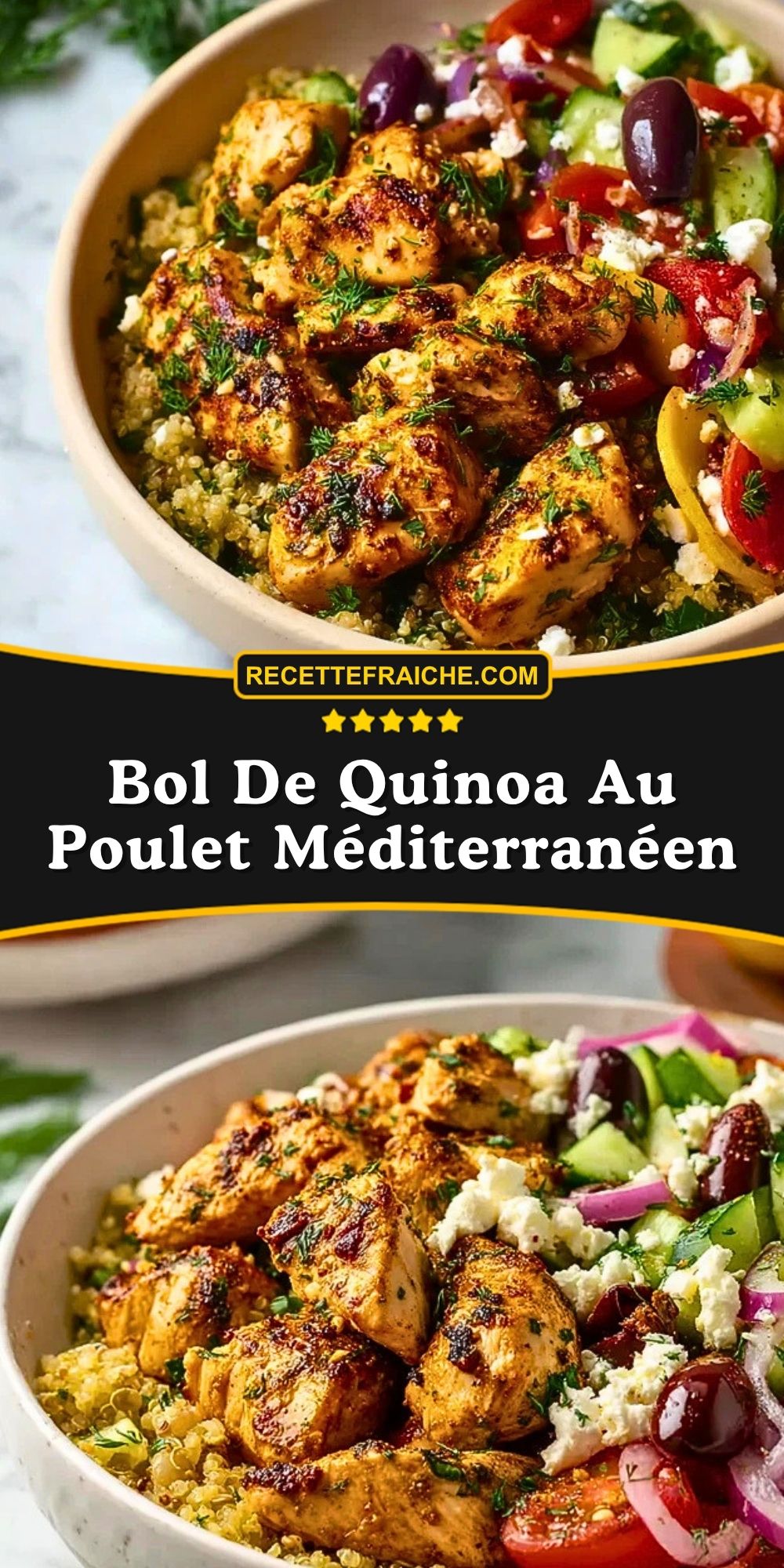 Keywords: bol de quinoa au poulet méditerranéen, quinoa poulet, recette saine, recette équilibrée, repas healthy, meal prep