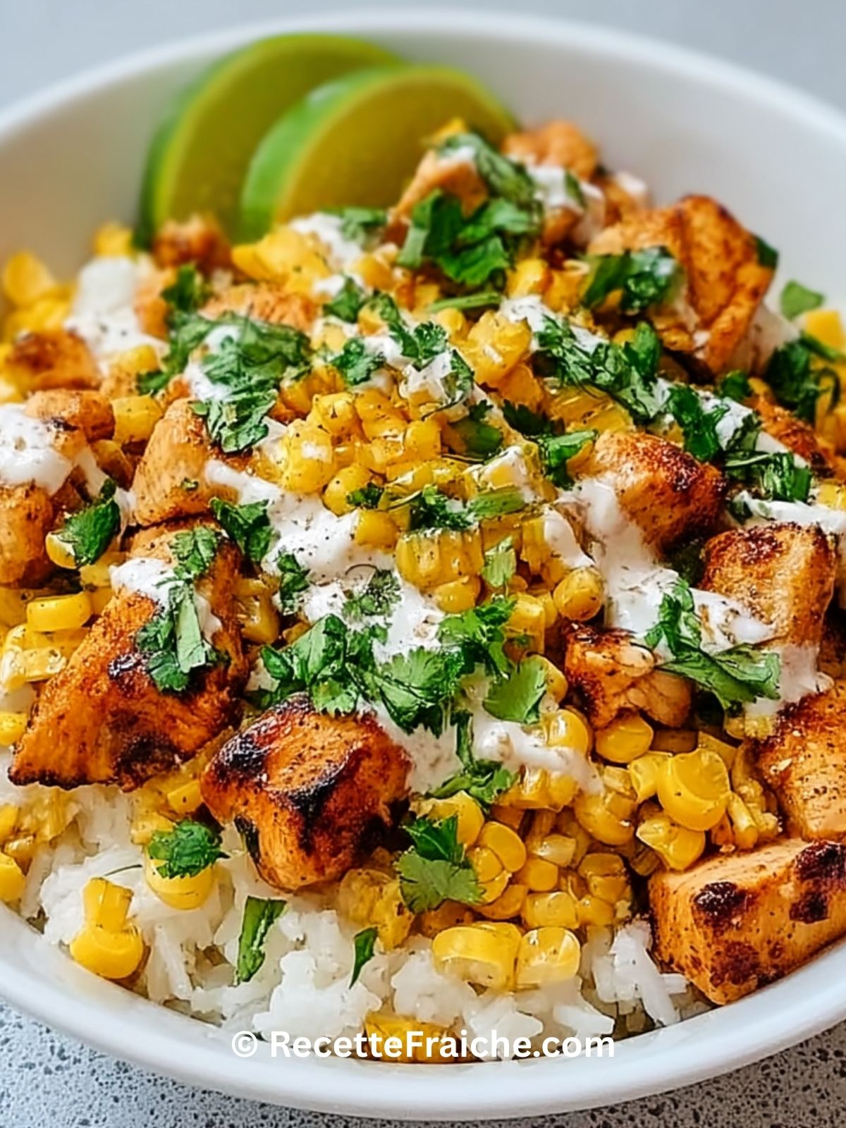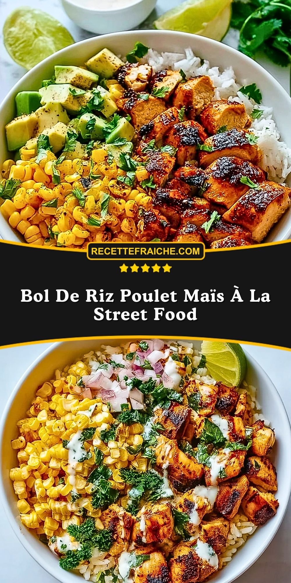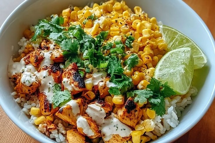 Bol de riz poulet maïs façon street food, une recette rapide et colorée : riz parfumé, poulet doré aux épices, maïs croquant, poivron et sauce crémeuse, pour un repas complet et savoureux prêt en 30 minutes.