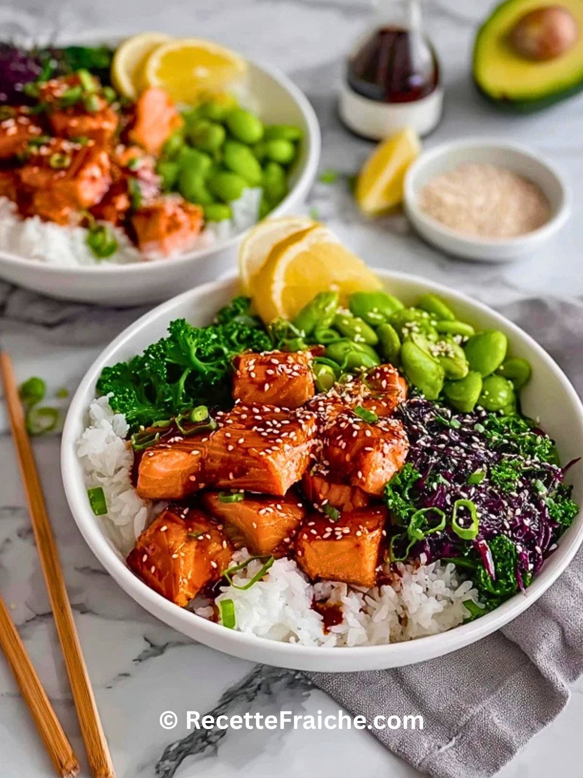 Keywords: bol de saumon teriyaki, saumon teriyaki, bowl saumon riz avocat, recette facile saumon, repas équilibré