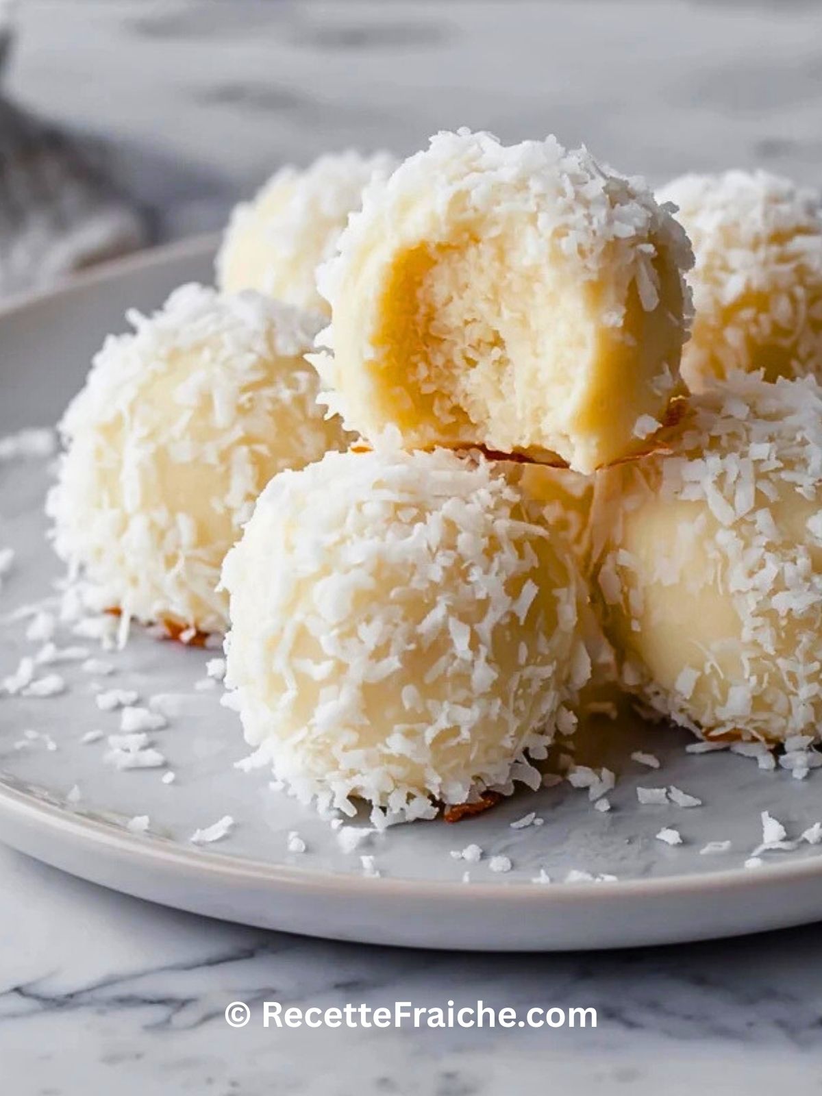4. Faites rouler chaque boule dans la noix de coco râpée restante pour bien les enrober.