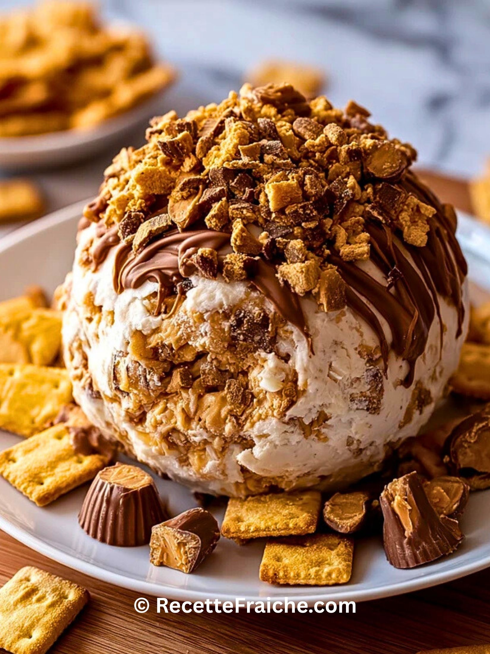 Cette Boule De Fromage Reeses est un dessert ultra gourmand façon cheesecake au beurre de cacahuète, truffé de morceaux de chocolat et de bonbons Reeses. Rapide à préparer et sans cuisson, elle se façonne en une grande boule enrobée de biscuits croquants, parfaite à déposer au centre de la table avec des biscuits et des fruits à tremper pour les fêtes et les soirées conviviales.