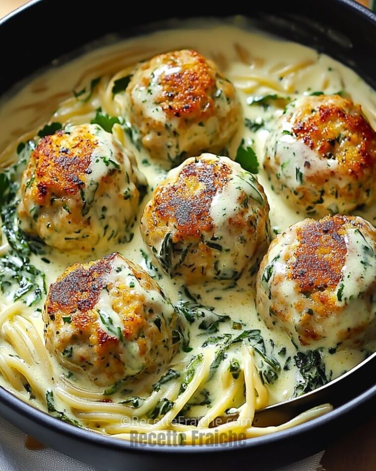 J’adore préparer ces boulettes de poulet au four à la ricotta avec leur irrésistible sauce Alfredo aux épinards. C’est une recette crémeuse, savoureuse et parfaitement équilibrée entre légèreté et gourmandise. La ricotta apporte une texture moelleuse aux boulettes, tandis que la sauce Alfredo aux épinards enveloppe le tout dans une onctuosité irrésistible. Servies avec des pâtes ou du riz, ces boulettes font toujours sensation à table.