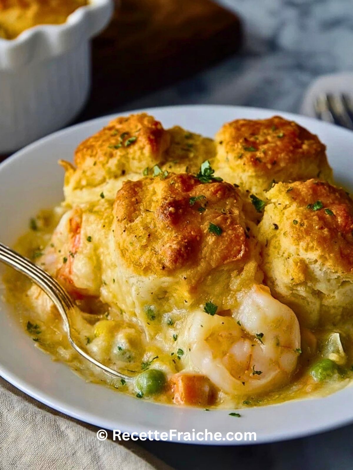J’adore la servir les soirs d’hiver ou quand je reçois des amis : tout cuit dans un seul plat, je n’ai quasiment plus rien à faire une fois le plat au four. Le contraste entre la sauce onctueuse et les biscuits au fromage est irrésistible, et chacun se sert à la cuillère, directement dans le plat, pour un moment très convivial.
