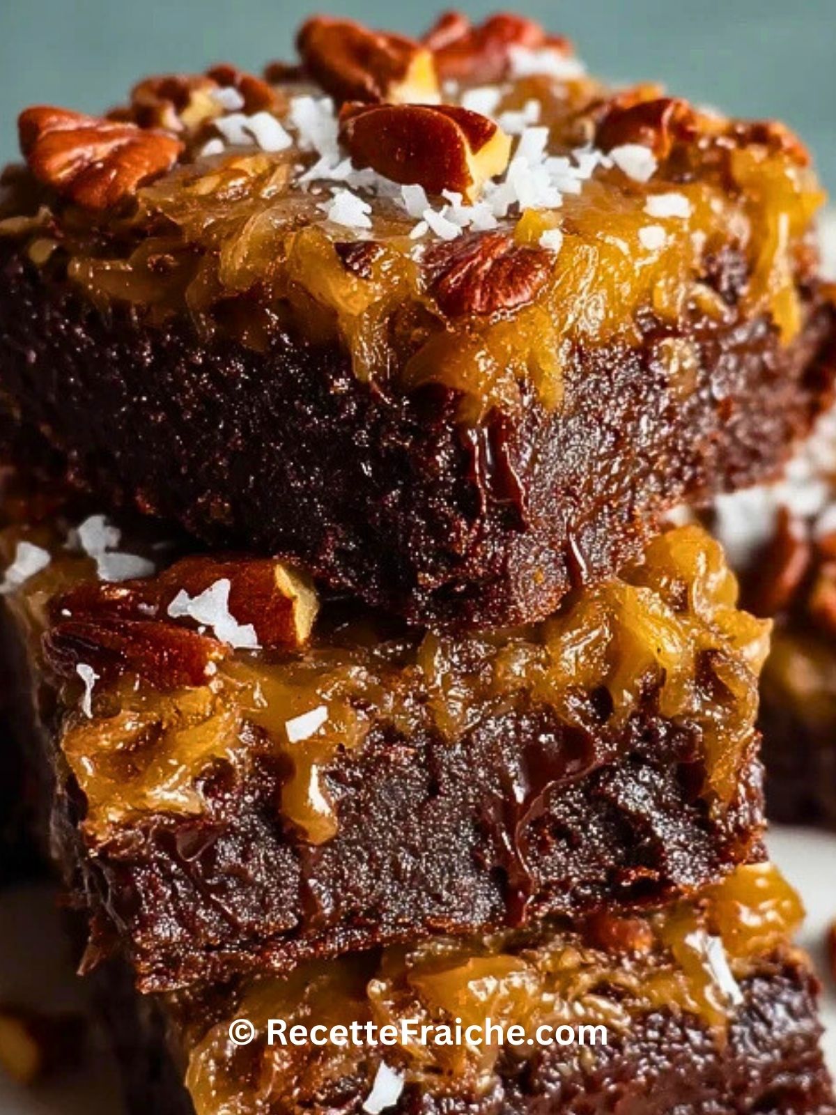 Brownies au chocolat allemand avec noix de pécan : un dessert ultra gourmand, moelleux et fondant, avec une couche de noix de coco caramélisée, surmonté de noix de pécan croquantes. Parfait pour se régaler en famille ou surprendre vos invités avec un brownie hors du commun.