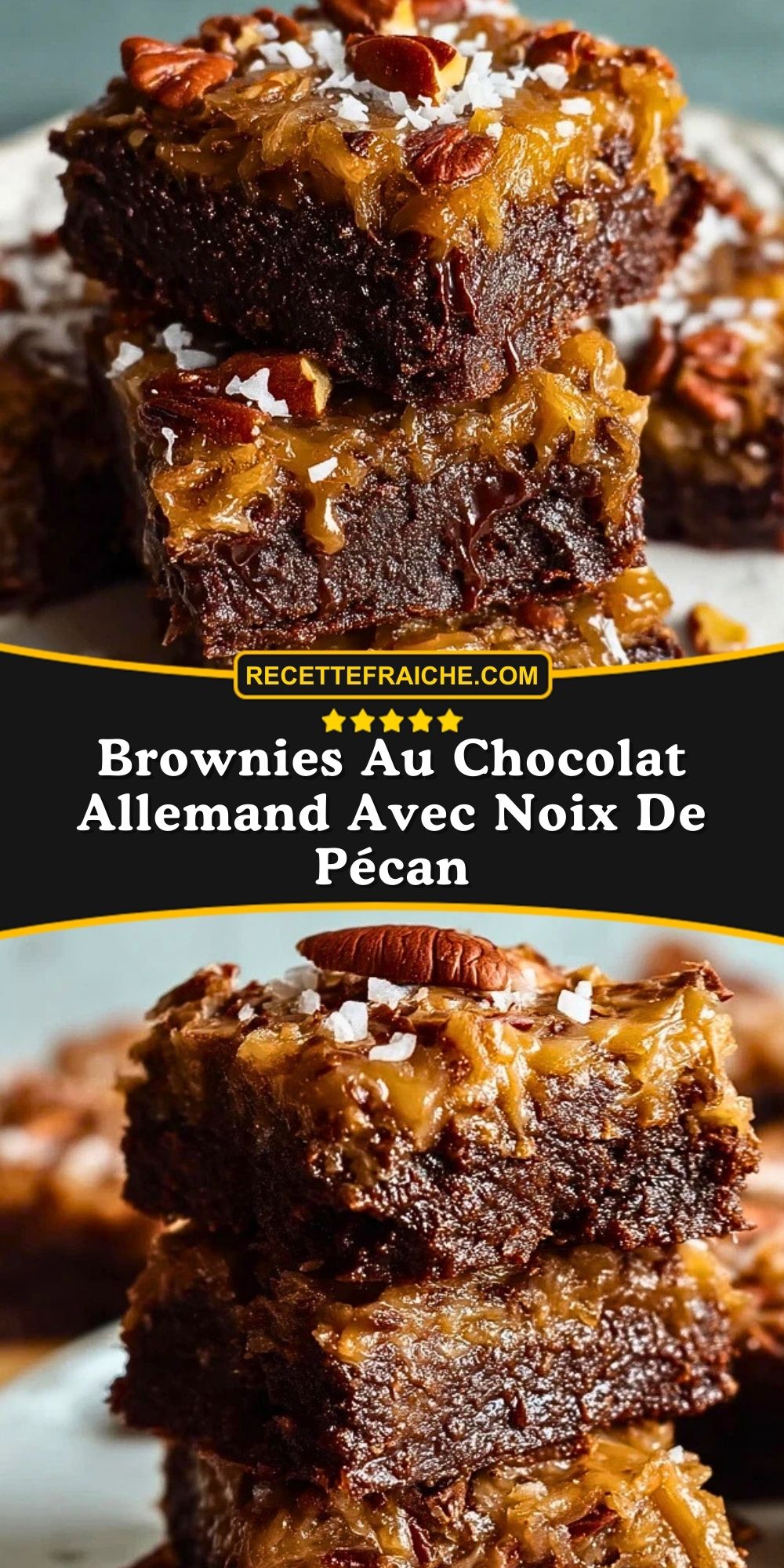 Quand j’ai envie de faire plaisir à toute la famille avec un dessert ultra gourmand, je prépare ces brownies au chocolat allemand avec noix de pécan. Leur moelleux irrésistible, leur parfum intense de cacao et leur garniture fondante à la noix de coco et aux noix de pécan en font un incontournable de mes goûters d’hiver. Chaque bouchée est un mélange de textures et de saveurs, entre le brownie riche et la douceur caramélisée de la garniture.