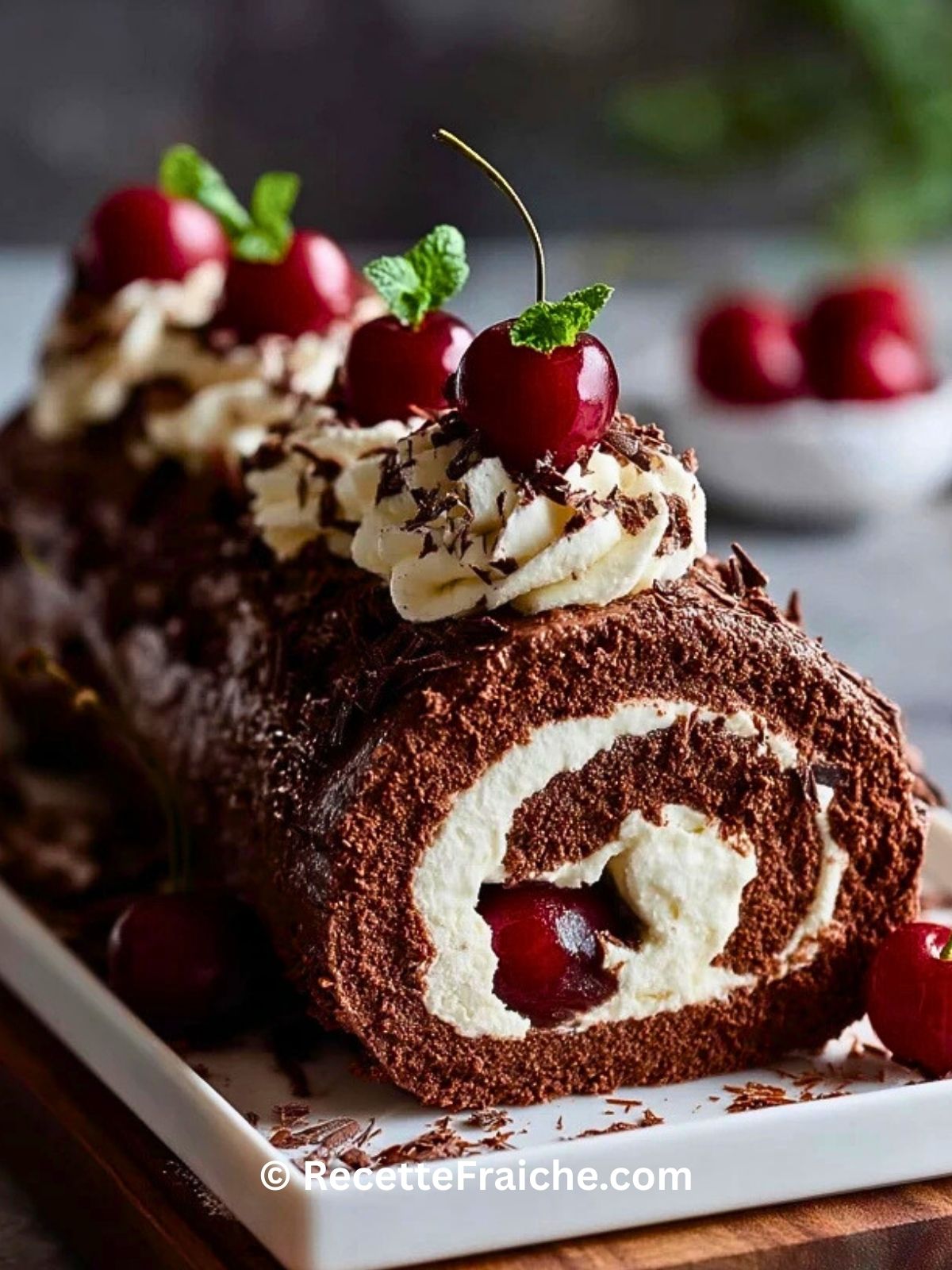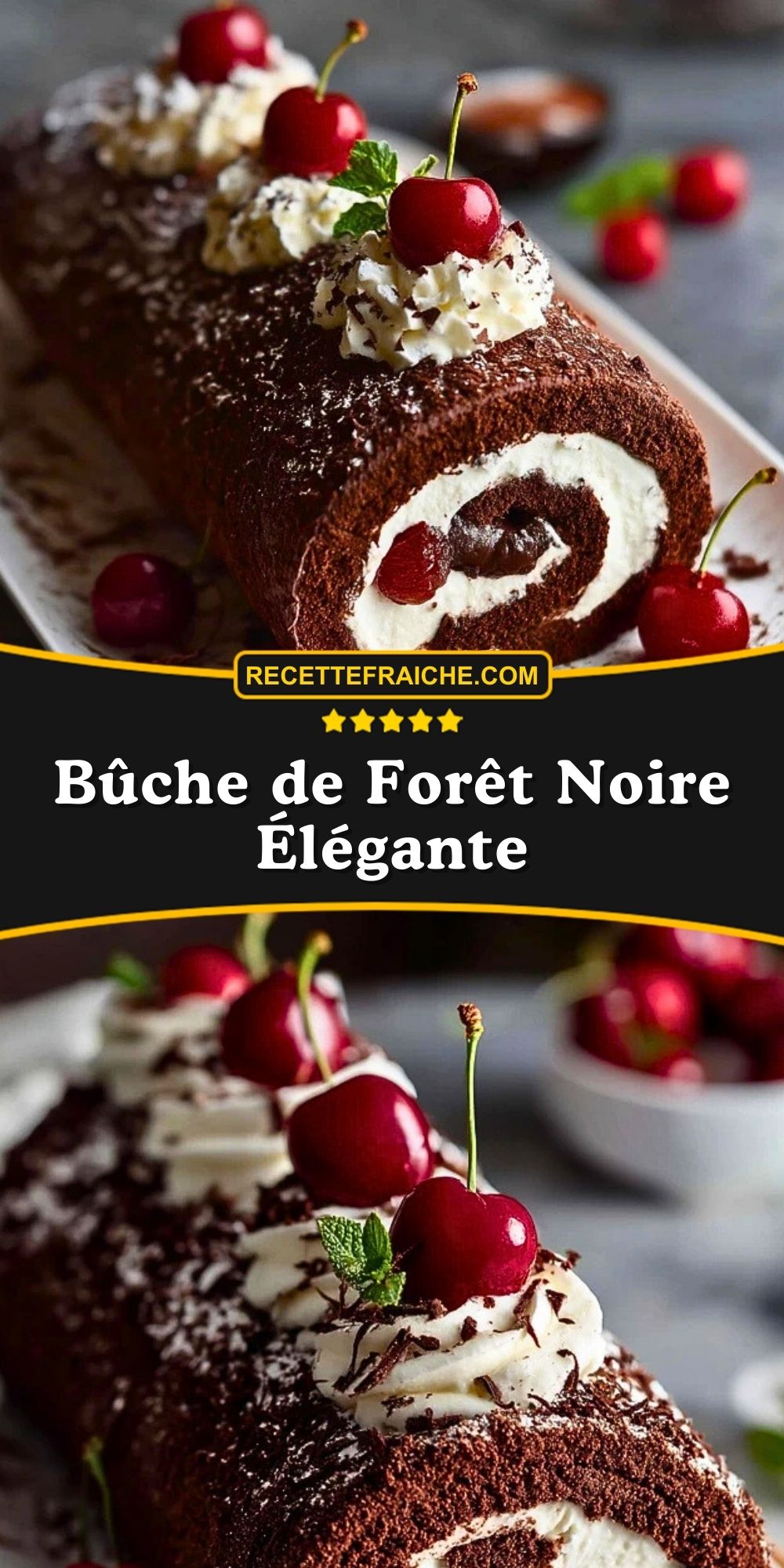 Keywords: bûche forêt noire, dessert chocolat cerise, roulé au chocolat, dessert de Noël