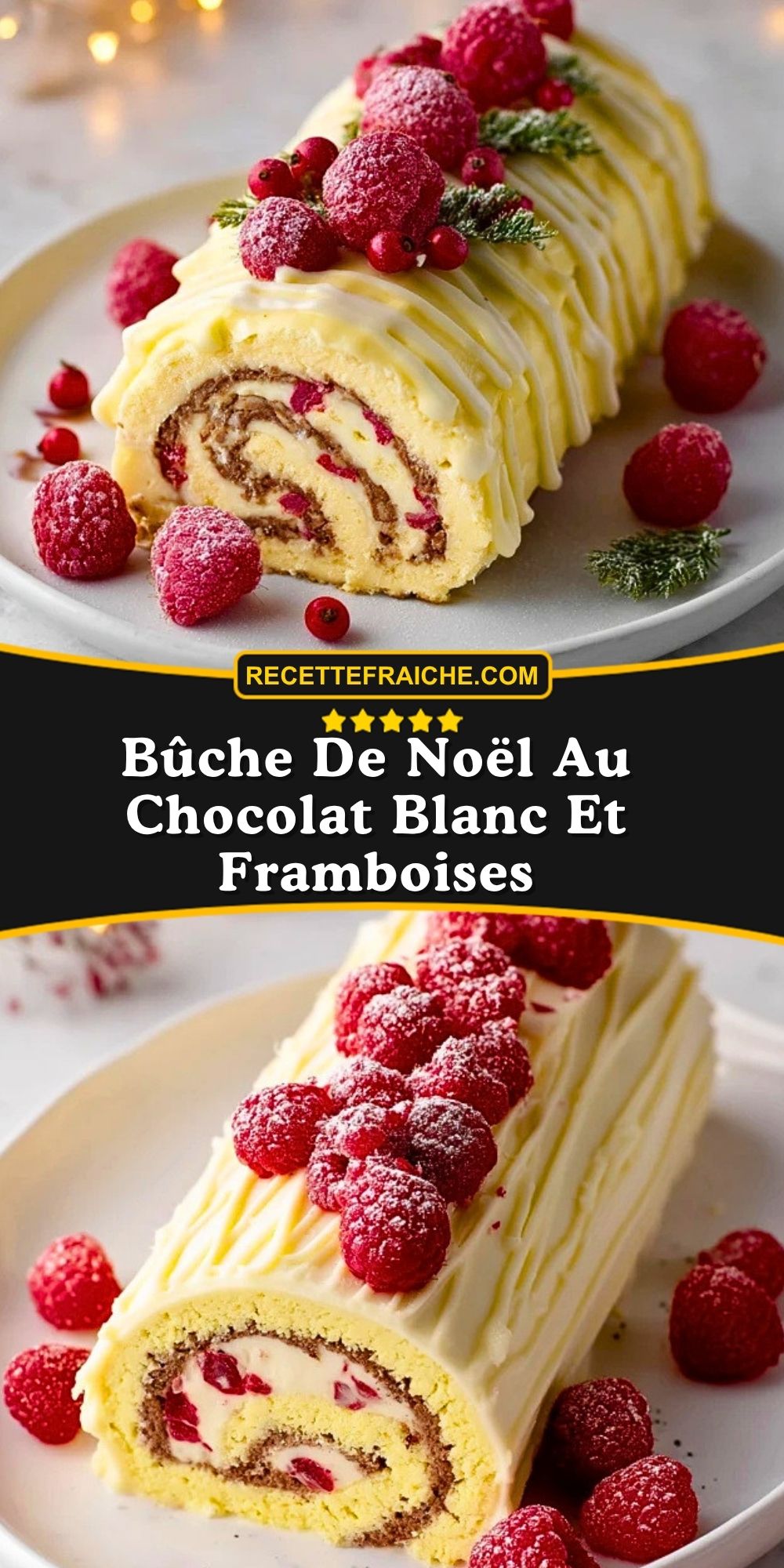 Keywords: bûche de Noël, chocolat blanc, framboises, dessert de fête, bûche roulée, recette de Noël