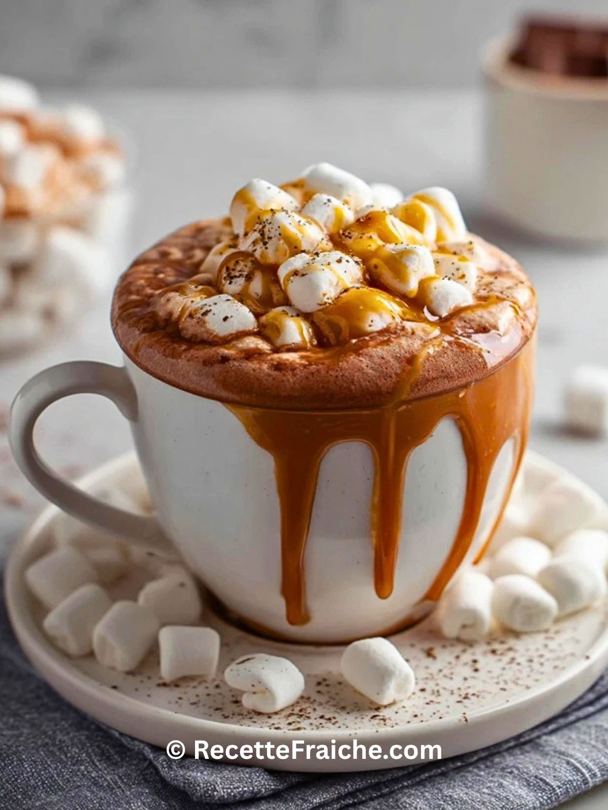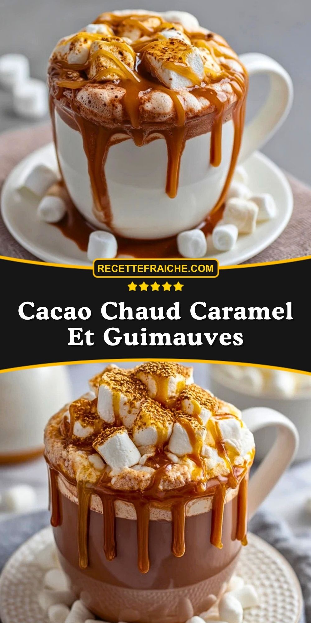 Keywords: cacao chaud caramel et guimauves, chocolat chaud gourmand, boisson chaude hiver, chocolat chaud caramel, recette cacao chaud maison