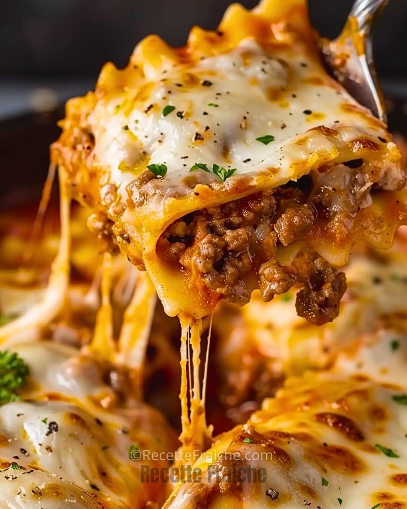 Préchauffez votre four à 180°C (350°F). Dans un plat à gratin, étalez une fine couche de sauce à la viande au fond du plat. Disposez une première couche de raviolis frais par-dessus, puis ajoutez une nouvelle couche de sauce. Saupoudrez généreusement de mozzarella râpée. Répétez l’opération jusqu’à épuisement des ingrédients, en terminant par une couche de fromage. Parsemez de parmesan pour une belle croûte dorée.