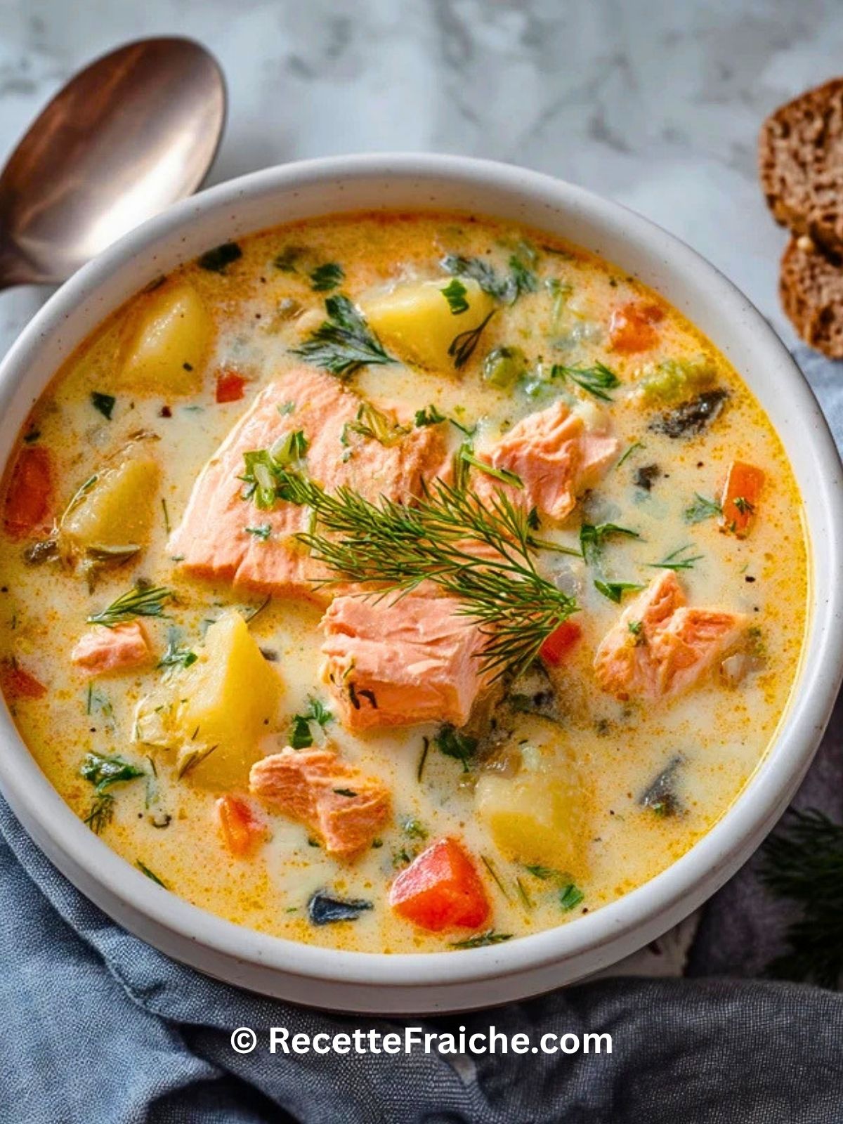 Cette chaudrée de saumon réconfortante est une soupe crémeuse et généreuse, parfaite pour un repas familial facile. Préparée avec du saumon tendre, des pommes de terre fondantes, des légumes savoureux, de la crème et de l’aneth frais, elle offre une recette chaleureuse, simple et délicieuse, idéale pour les soirées fraîches et les envies de plat réconfortant.