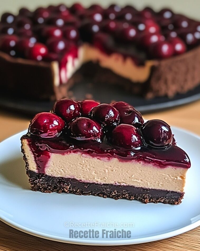 Un cheesecake ultra-gourmand associant l’intensité du chocolat noir à la douceur acidulée des cerises. Sa base croquante au cacao, sa texture fondante et sa garniture fruitée en font un dessert irrésistible, idéal pour toutes les occasions. Préparé à l’avance, il est encore meilleur après une nuit de repos au réfrigérateur.