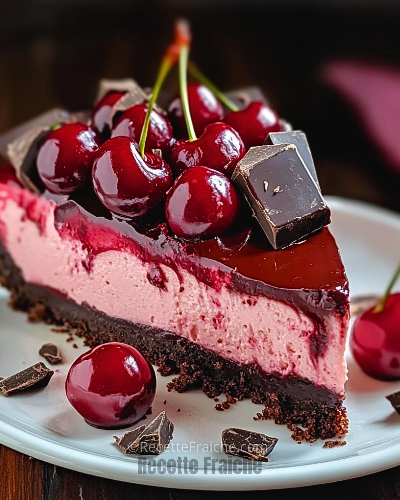 Un cheesecake ultra-gourmand associant l’intensité du chocolat noir à la douceur acidulée des cerises. Sa base croquante au cacao, sa texture fondante et sa garniture fruitée en font un dessert irrésistible, idéal pour toutes les occasions. Préparé à l’avance, il est encore meilleur après une nuit de repos au réfrigérateur.