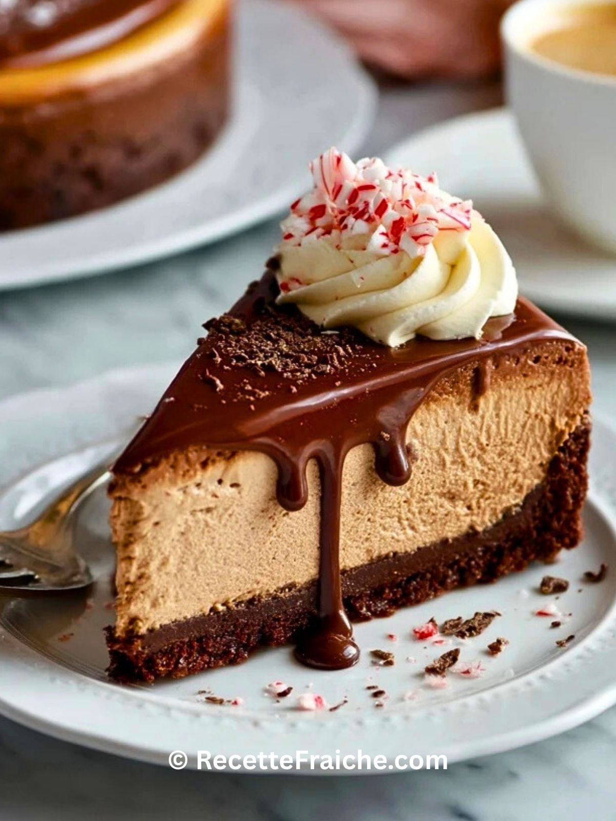 Ce cheesecake au chocolat et menthe poivrée est ultra fondant, à la base croquante, relevé par une note fraîche et festive. Sa crème douce au chocolat et à la menthe, sa finition gourmande et sa décoration croquante en font le dessert parfait pour régaler famille et invités lors des fêtes ou pour une occasion spéciale.
