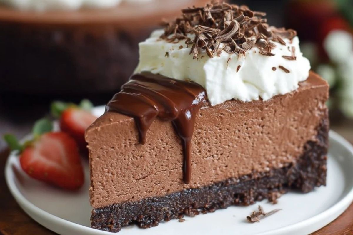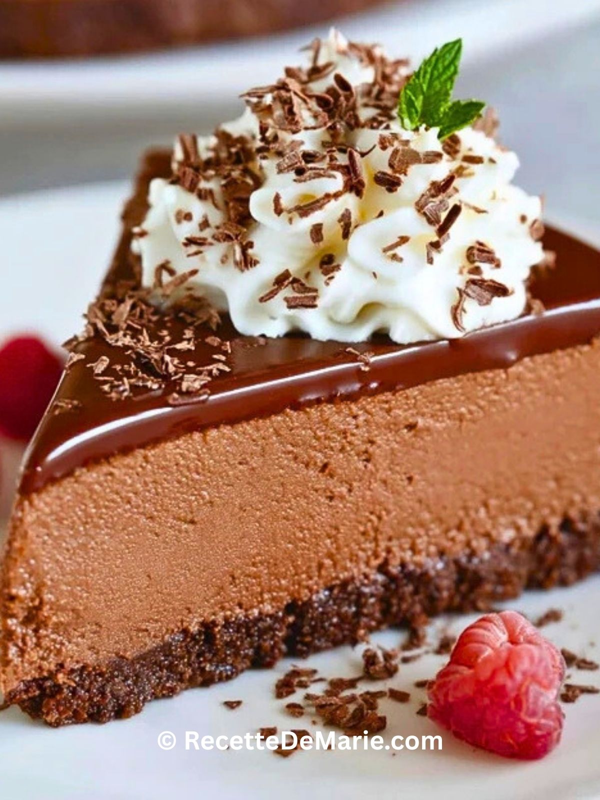 Cheesecake au chocolat sans cuisson, ultra crémeux et fondant, avec une base biscuitée intense et une crème au chocolat riche et légère. Dessert facile et élégant, parfait à préparer à l’avance.