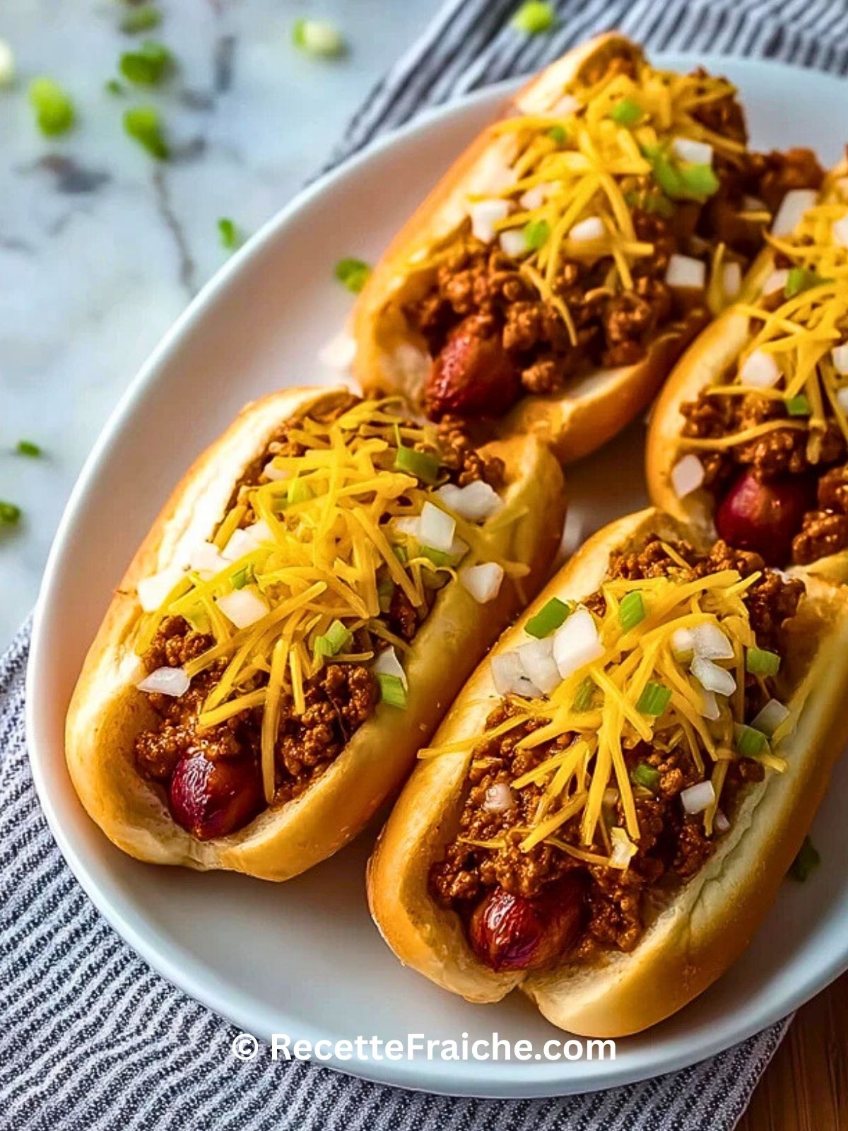 - Chili con carne : c’est l’élément principal de la garniture ; utilisez un chili épais pour éviter que le pain ne ramollisse trop vite.