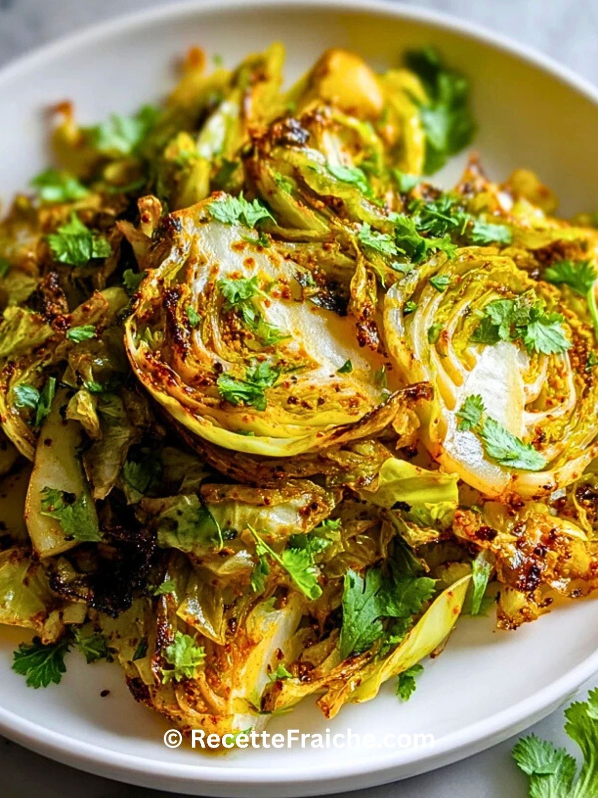 À la sortie du four, goûtez et rectifiez l’assaisonnement en sel. Arrosez de jus de citron frais, ajoutez le piment vert haché si vous aimez les plats relevés, puis parsemez de coriandre fraîche ciselée. Servez immédiatement, tant que le chou est bien chaud et croustillant.