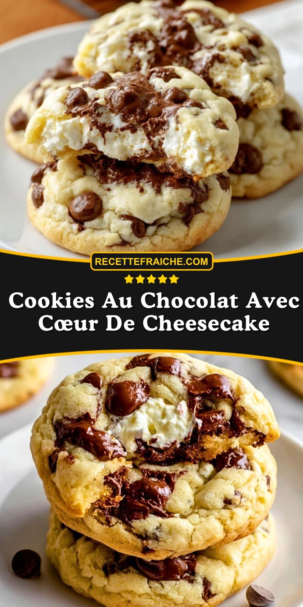 Le chocolat noir apporte un contraste plus intense avec le cœur cheesecake, tandis que le chocolat au lait donne un résultat plus doux et très gourmand. Un mélange des deux fonctionne très bien si vous aimez les cookies riches en chocolat sans trop d’amertume.