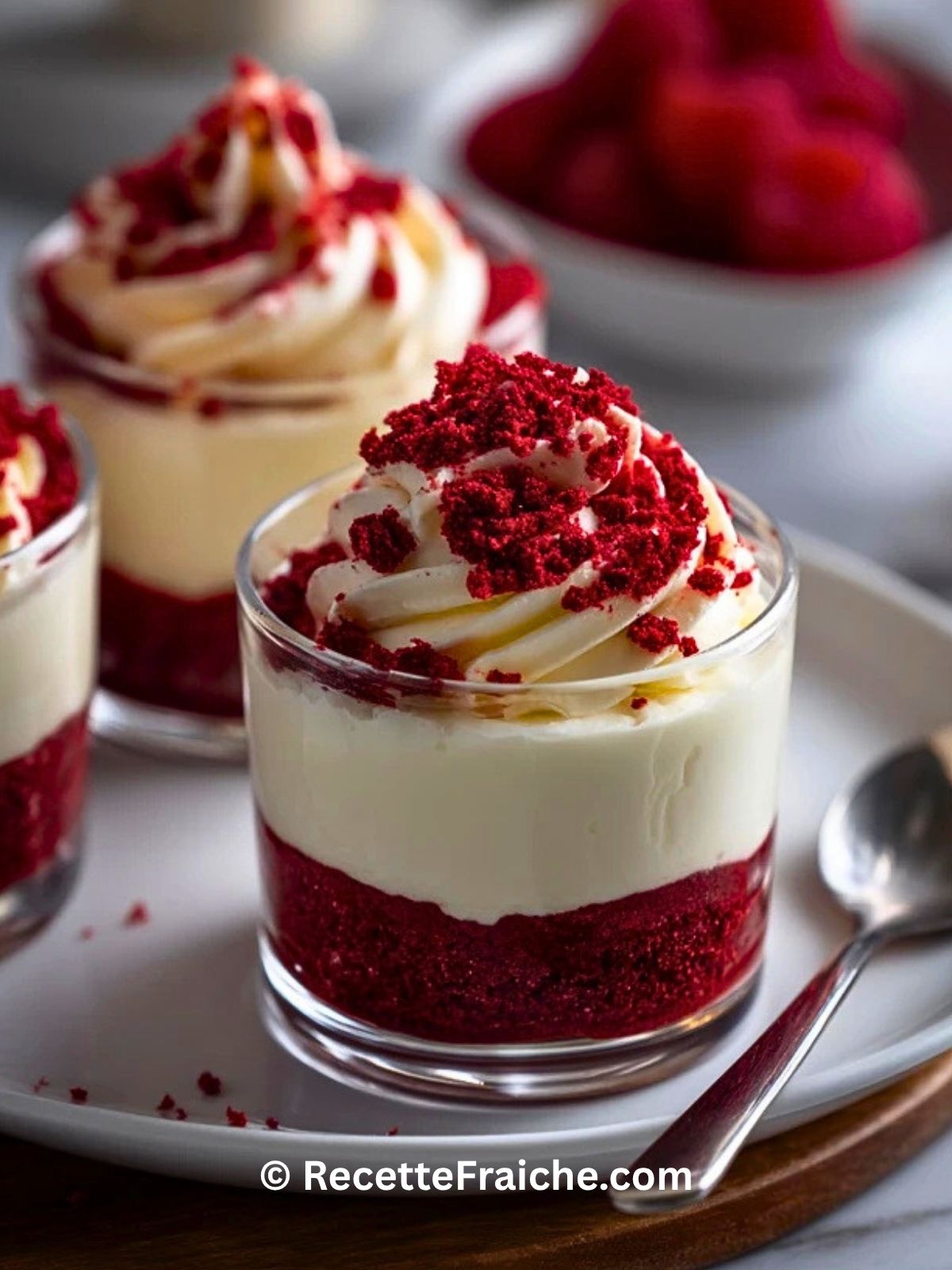 Ces verrines sont aussi belles que délicieuses, avec un visuel spectaculaire qui impressionne sans demander des techniques compliquées. La texture joue un grand rôle dans leur succès : une base façon gâteau red velvet tendre et légèrement humide, surmontée d’une mousse vanille crémeuse qui fond en bouche.