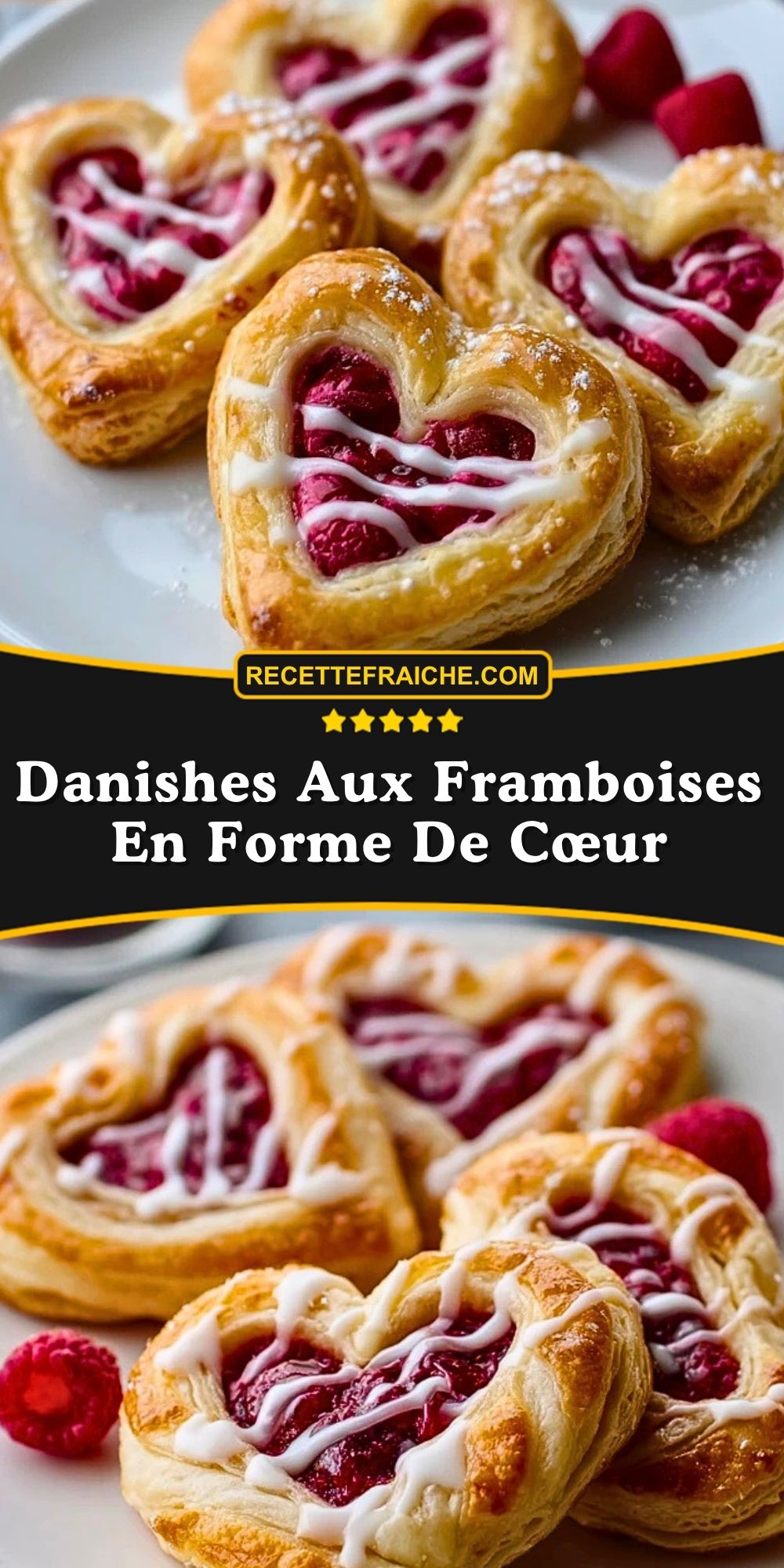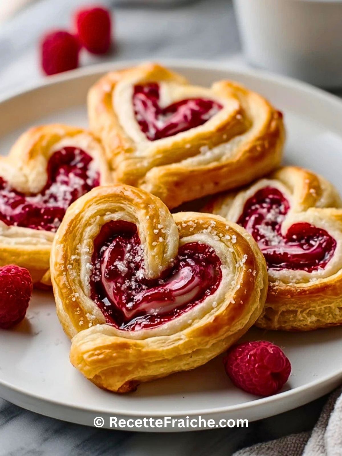 Keywords: danishes aux framboises en forme de cœur, viennoiserie feuilletée, dessert aux framboises, recette brunch sucré, pâte feuilletée framboise