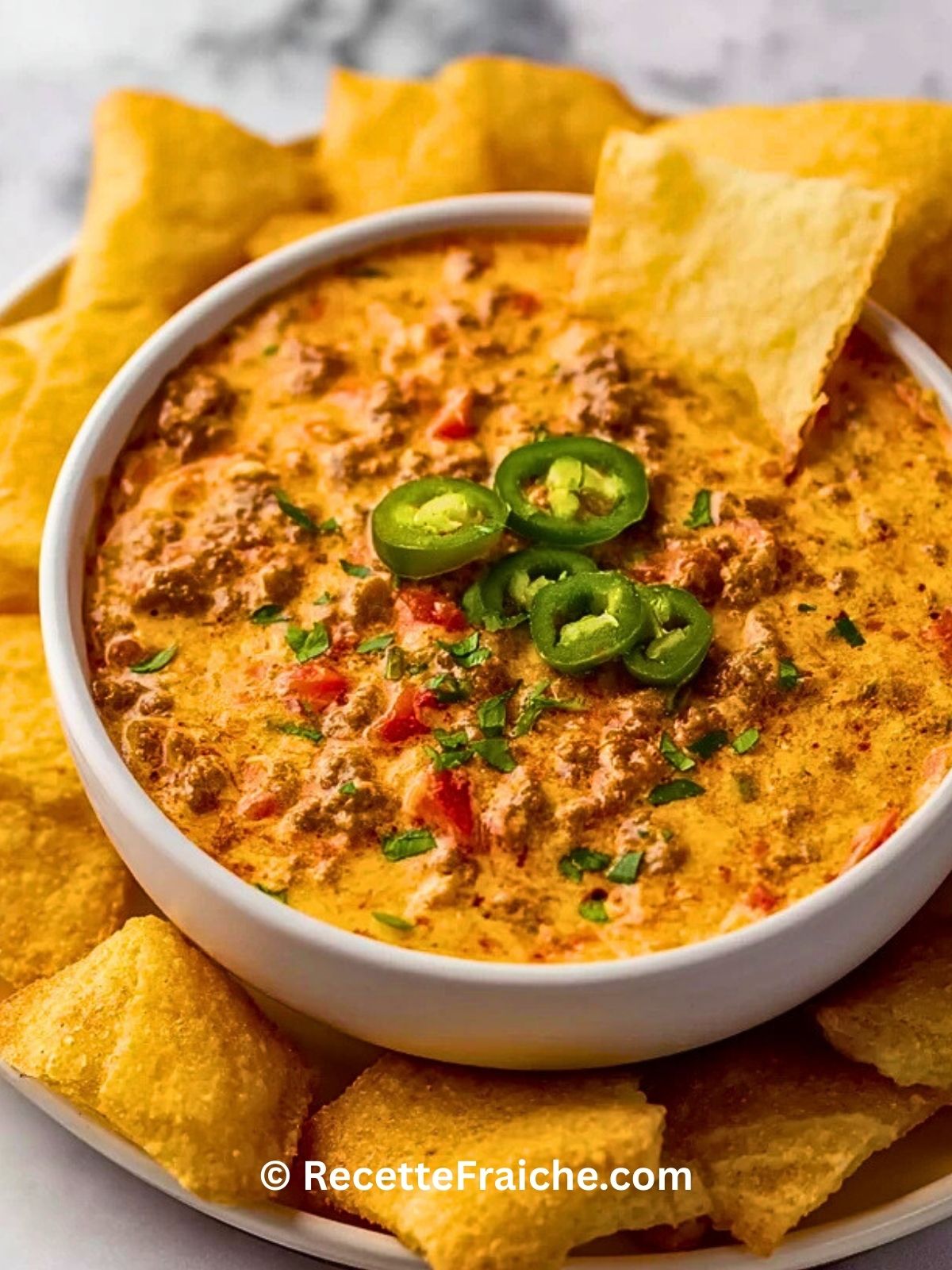 Une trempette chaude et crémeuse au bœuf haché, tomates Rotel et fromage fondu, parfaite pour un apéro convivial ou une soirée télé. Facile, rapide, et délicieusement relevée.