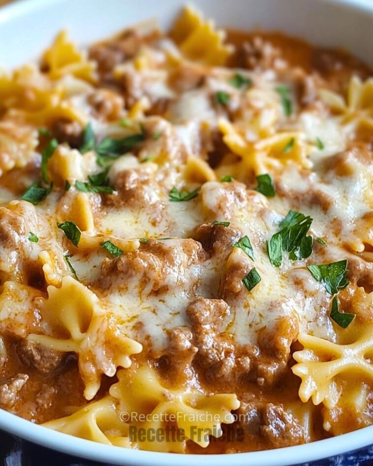J’adore les plats de pâtes réconfortants, et cette recette de pâtes au bœuf en nœuds papillon est un véritable délice. Entre la tendreté du bœuf haché, la richesse de la sauce crémeuse et le fondant du fromage gratiné, chaque bouchée est un pur plaisir. C’est une recette qui me rappelle les repas conviviaux en famille, où chacun se sert généreusement et revient pour une deuxième assiette.