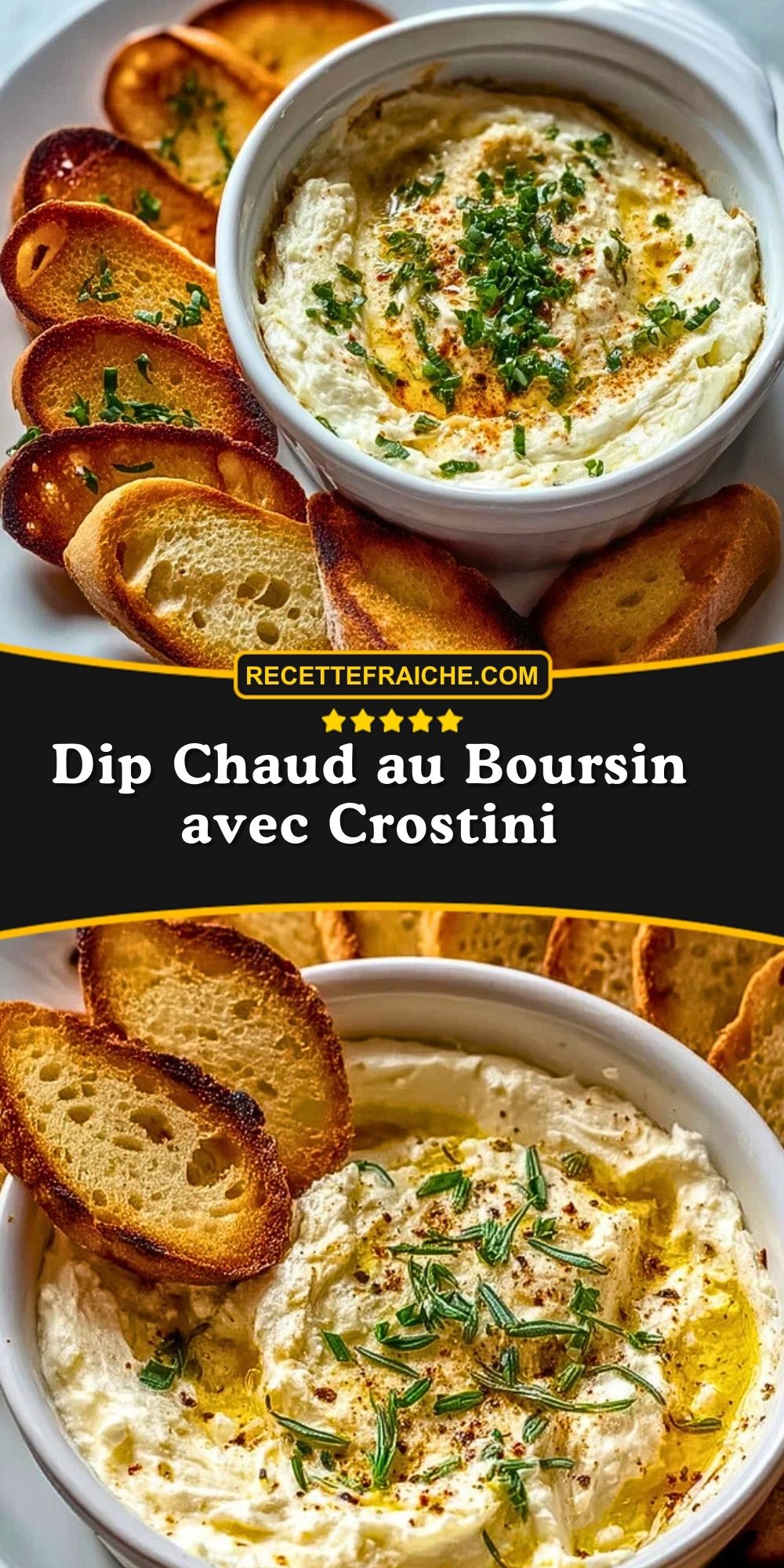 Keywords: dip chaud, boursin, apéritif facile, fromage fondu, crostini maison
