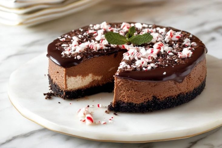 Gâteau moelleux au chocolat intense, subtilement parfumé à la menthe poivrée, avec un glaçage fondant et des éclats croquants de bonbons à la menthe. Un dessert festif et raffiné pour l’hiver.