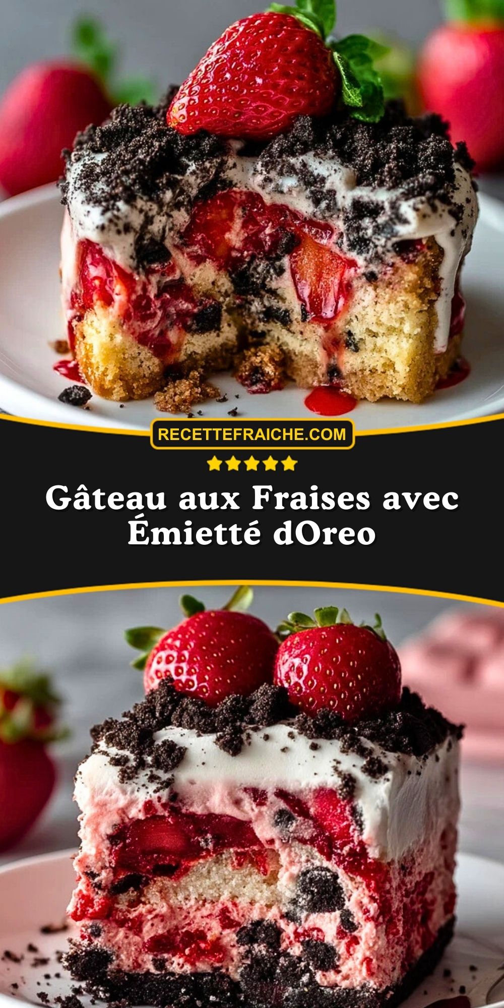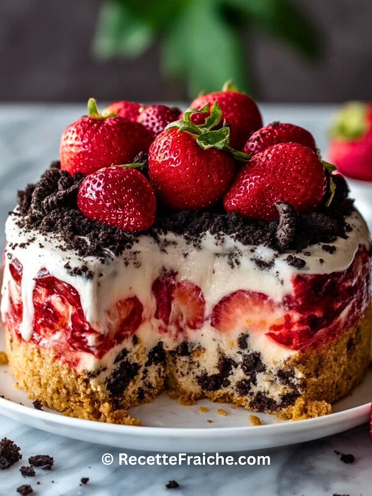 Keywords: gâteau aux fraises avec émietté dOreo, dessert sans cuisson, cheesecake fraises Oreo, gâteau frais aux fraises, dessert facile