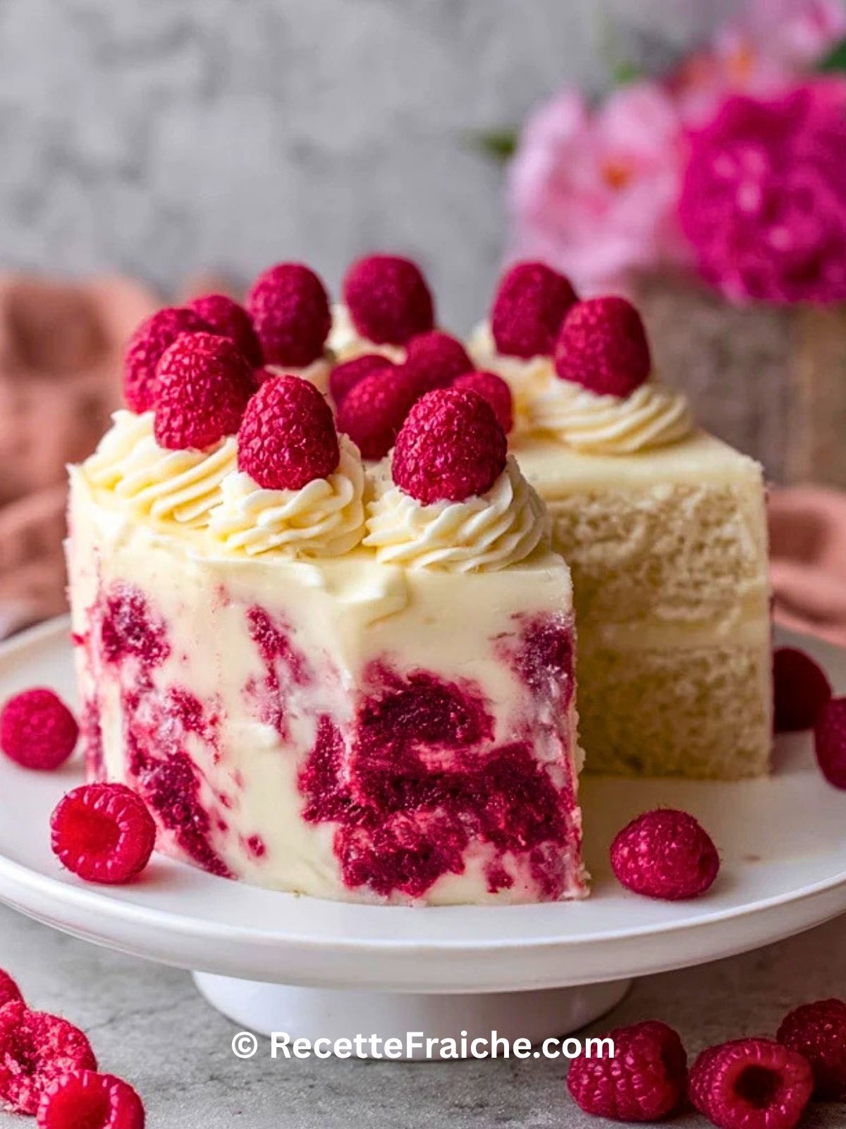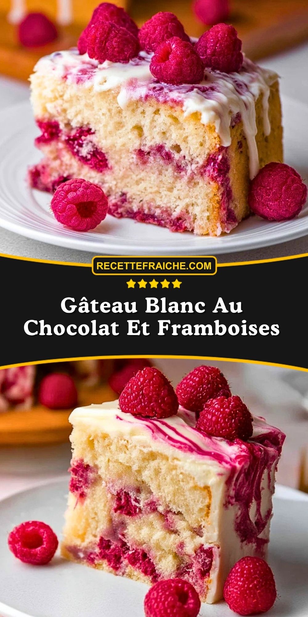 Keywords: gâteau blanc au chocolat et framboises, gâteau framboises, dessert chocolat blanc, gâteau moelleux aux framboises, recette dessert facile