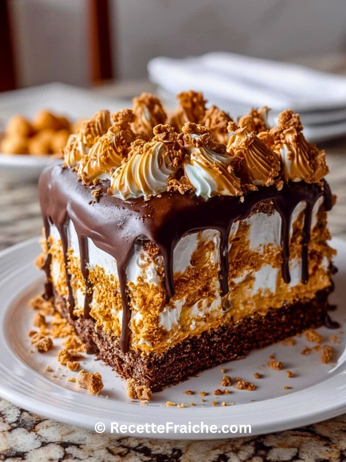 Terminez avec les éclats de chocolat, les morceaux de bombes au beurre de cacahuète et les miettes de biscuits autour du gâteau. Placez au frais 20 à 30 minutes avant la découpe pour des parts nettes et élégantes.