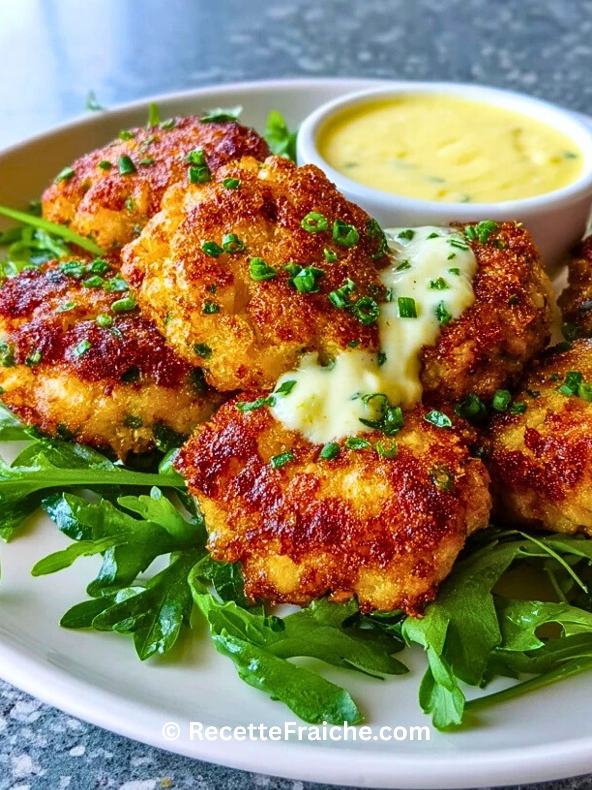 5. Servez les gâteaux chauds avec l’aïoli au citron en accompagnement.