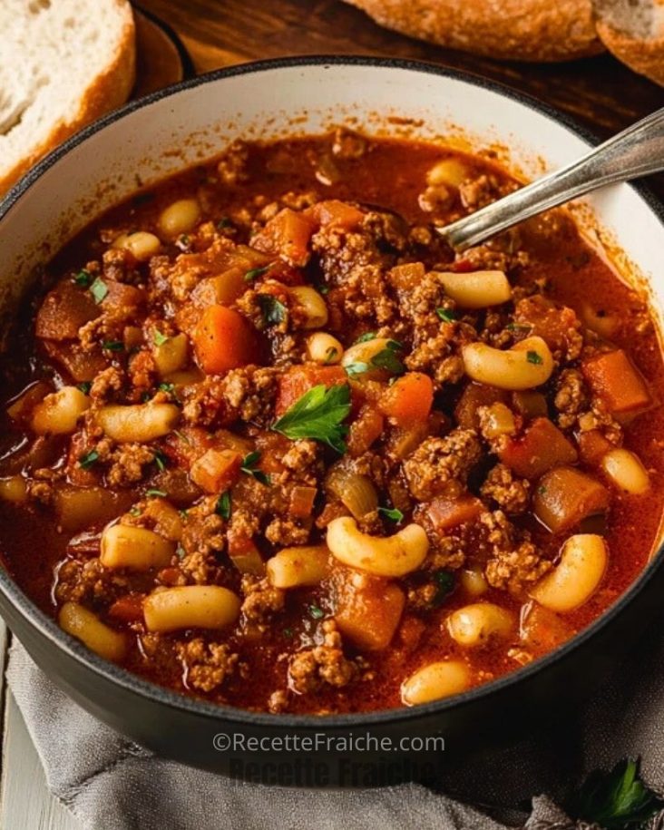 Un goulash mijoté, riche en saveurs et parfait pour les soirées d’hiver : viande hachée, légumes fondants, pâtes tendres et sauce tomate parfumée au paprika. Une recette familiale facile, nourrissante et ultra-réconfortante.