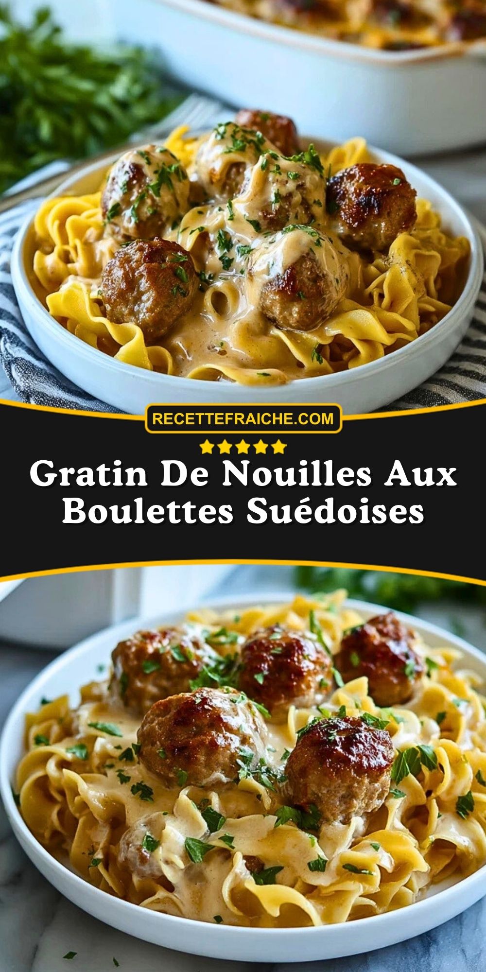 Keywords: gratin de nouilles, boulettes suédoises, pâtes au four, plat familial, recette réconfortante