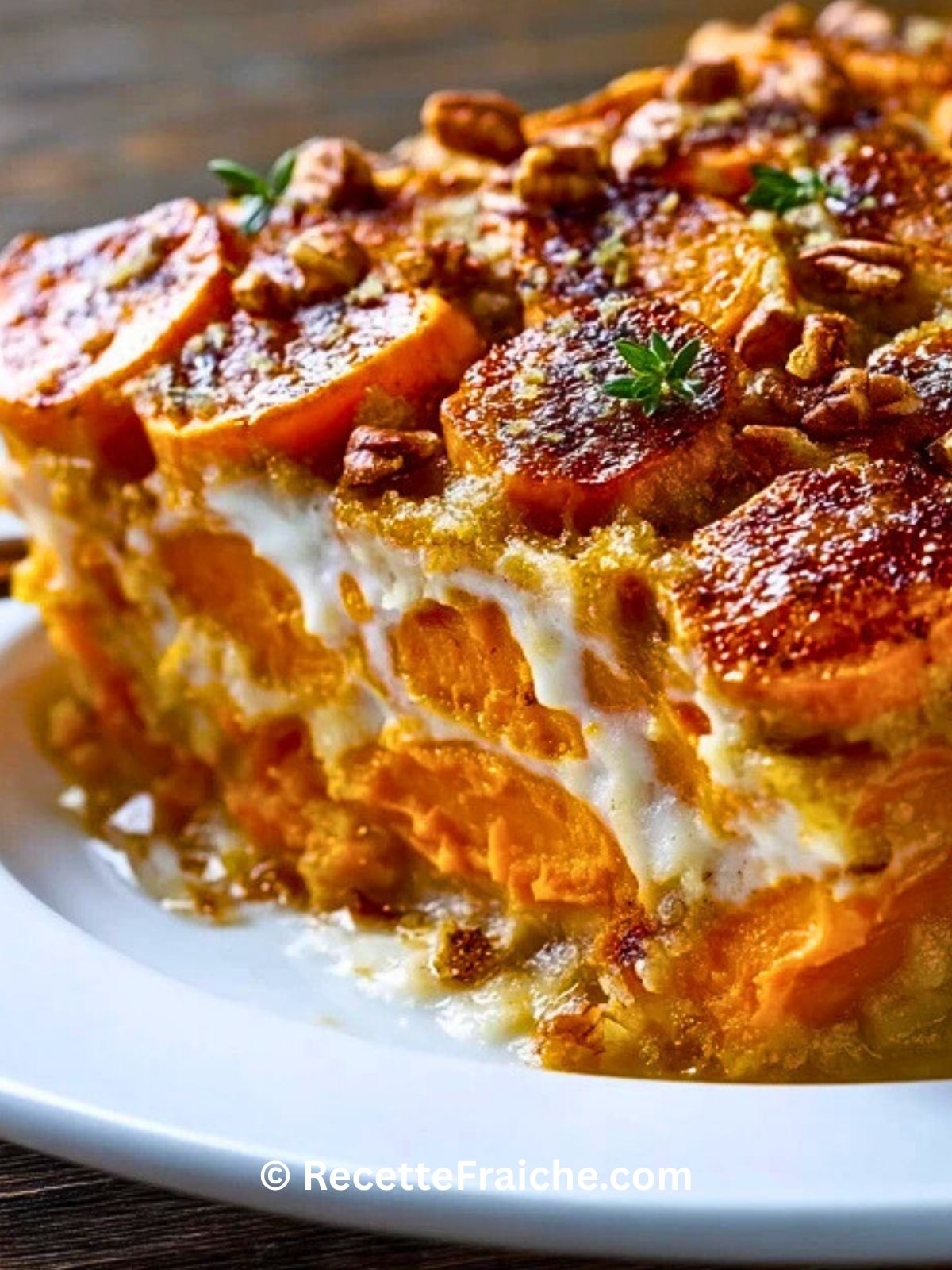 Versez la préparation dans un plat à gratin beurré. Parsemez de noix de pécan concassées. Enfournez pour 30 à 35 minutes, jusqu’à ce que la surface soit dorée et croustillante.
