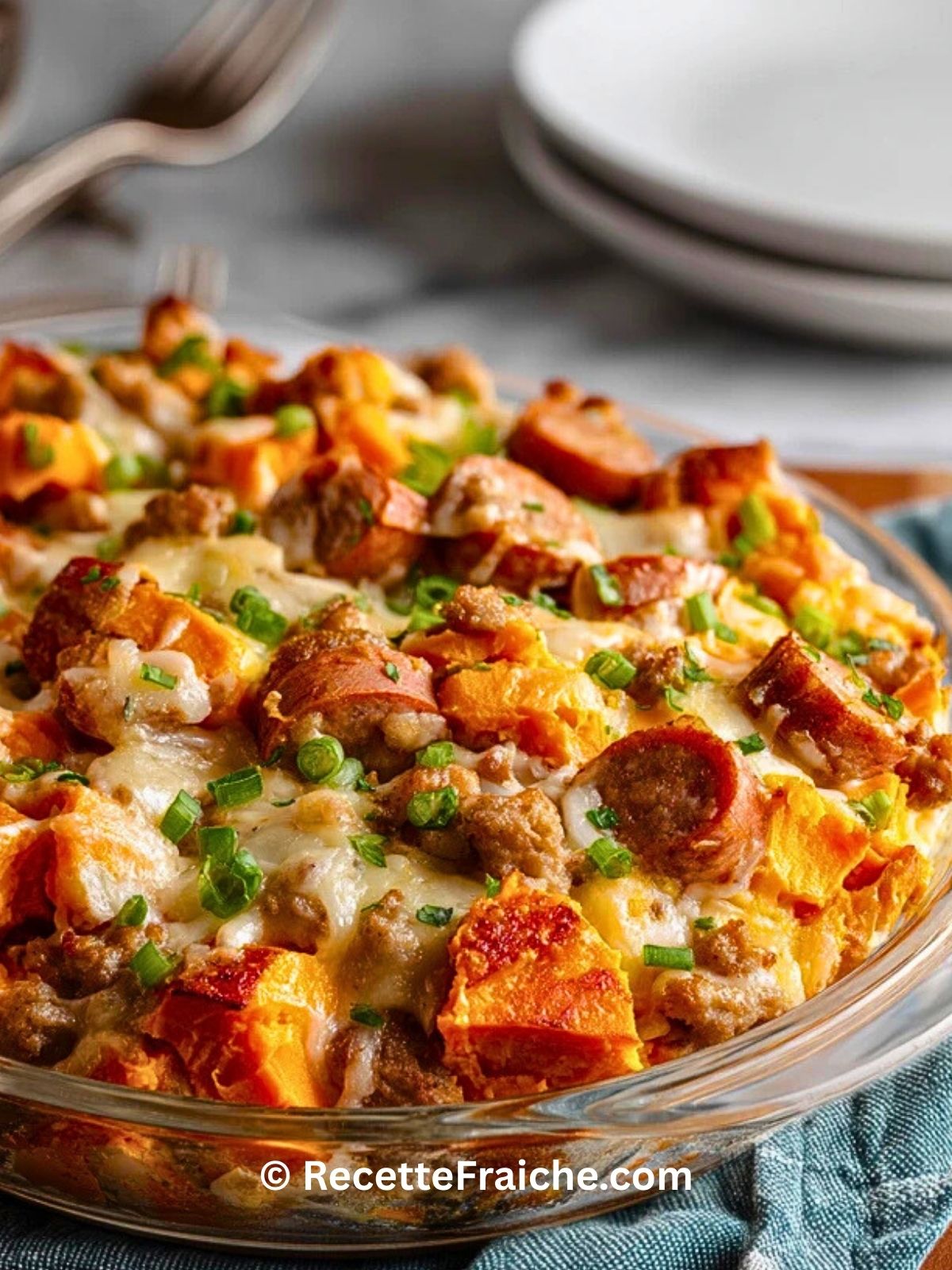 Ce que j’aime dans cette recette, c’est qu’elle demande peu d’ingrédients, mais délivre un maximum de goût. La patate douce devient fondante à la cuisson, tandis que la saucisse se parfume d’aromates et se marie délicieusement à la crème et au fromage. Un plat complet et ultra savoureux, prêt à conquérir toutes les tables !