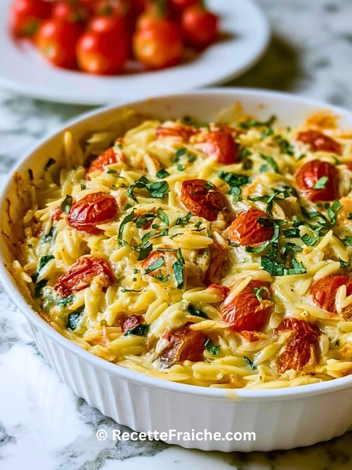 Oui, vous pouvez préparer la base crémeuse avec l’orzo quelques heures à l’avance, la verser dans le plat, puis ajouter les tomates et le fromage juste avant l’enfournement. Cela permet de gagner du temps au moment du repas sans perdre le côté fondant.