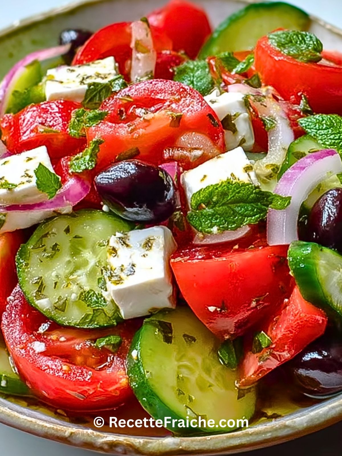 - Évitez de couper les légumes trop petits, la salade grecque se veut rustique.