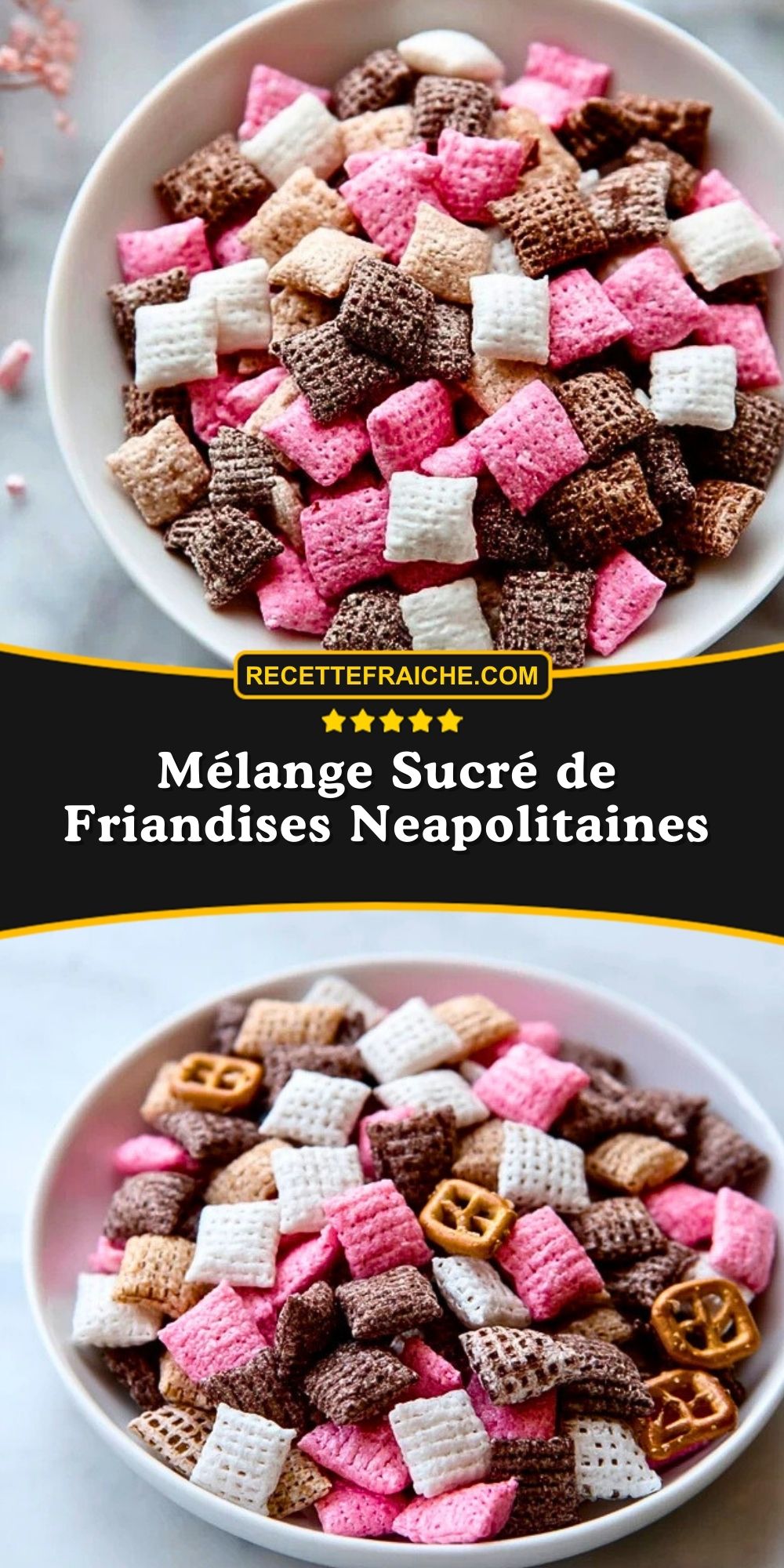 Le mélange sucré de friandises napolitaines est une explosion de couleurs, de textures et de saveurs qui rappelle les fêtes d’enfance et les plaisirs simples. J’adore préparer ce mélange pour les goûters festifs ou comme petit cadeau maison : il fait toujours son effet. Inspiré des célèbres glaces napolitaines, il combine les saveurs classiques de fraise, vanille et chocolat dans un format amusant et facile à grignoter.