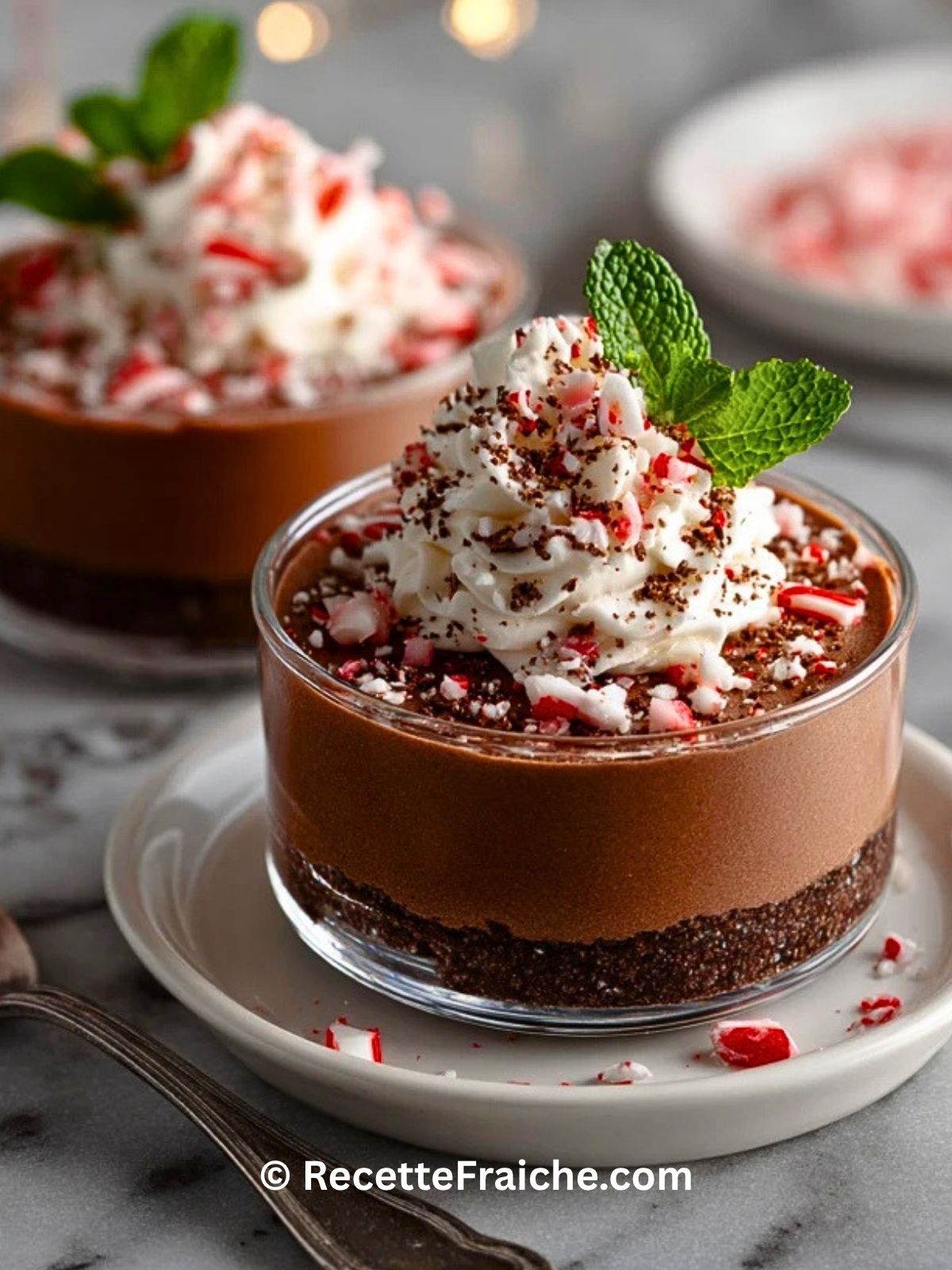 Quand je la sers dans de jolies coupes avec un nuage de chantilly et quelques éclats de bonbons à la menthe, elle fait toujours son petit effet. C’est le genre de dessert que je prépare aussi bien pour les fêtes que pour un dîner cocooning à la maison, parce qu’il est élégant sans être compliqué.