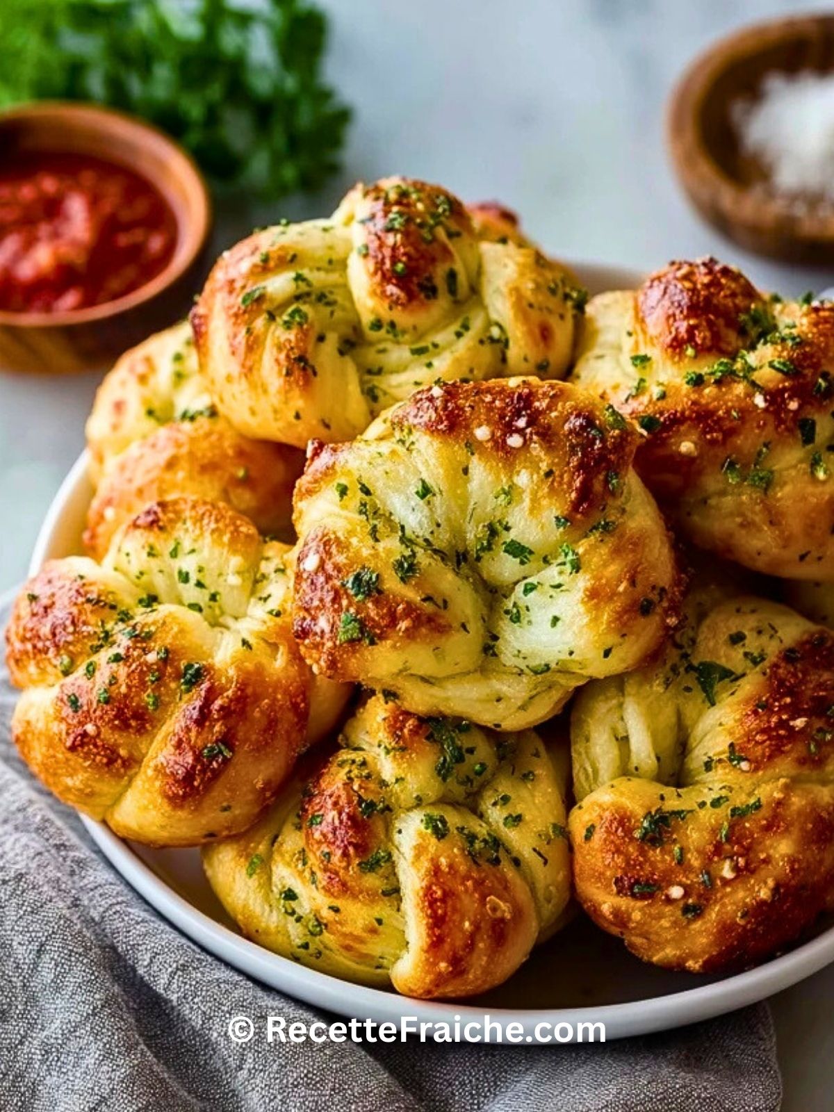 Keywords: nœuds à l’ail, garlic knots, pain à l’ail maison, accompagnement italien, pâte à pizza, recette apéritive, pain moelleux