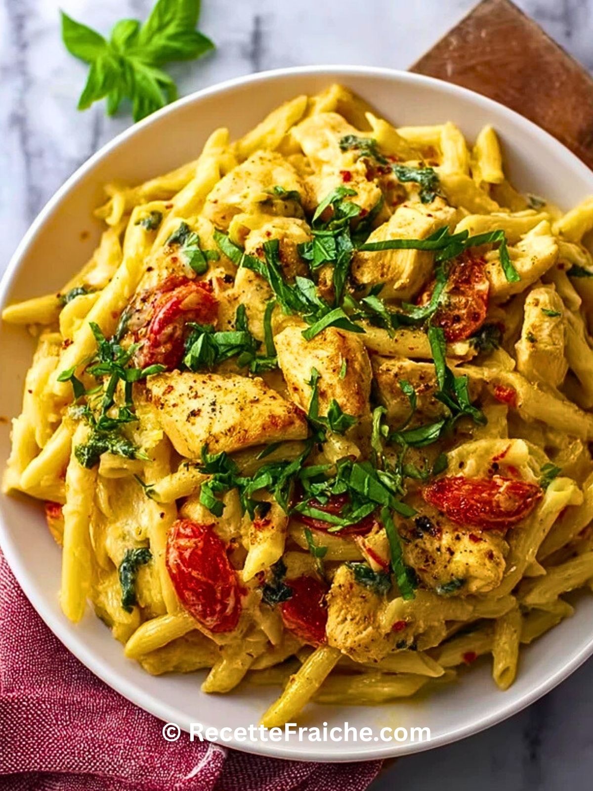 Des pâtes crémeuses au poulet, ail, tomates séchées et parmesan, prêtes en 25 minutes. Une recette simple, savoureuse et parfaite pour un dîner rapide ou romantique.